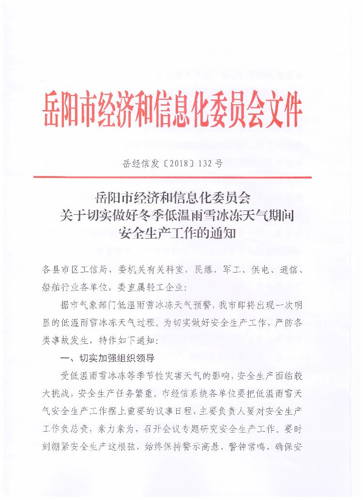 岳阳市经济和信息化委员会关于切实做好冬季低温雨雪冰冻天气期间安全生产工作的通知