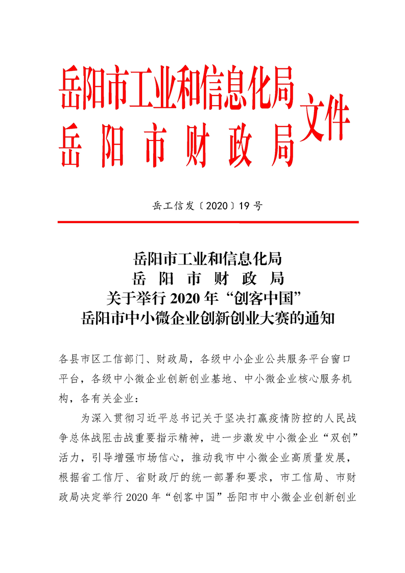 关于举行 2020 年“创客中国”岳阳市中小微企业创新创业大赛的通知