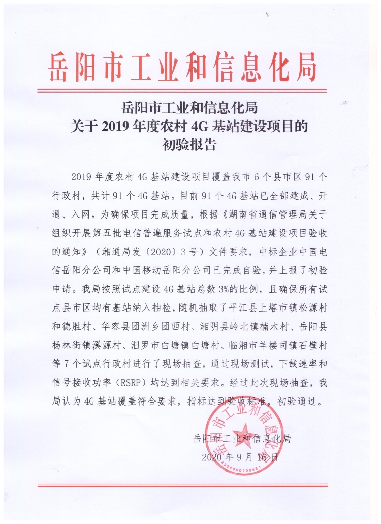 岳阳市工业和信息化局关于2019年度农村4G基站建设项目的初验报告