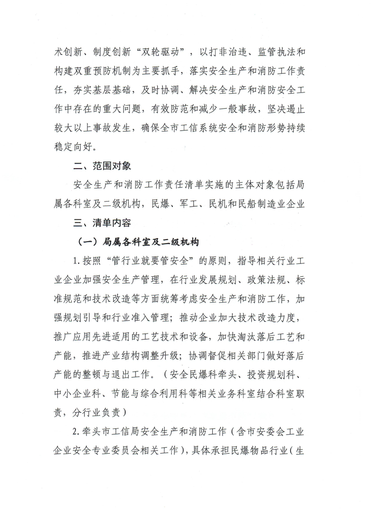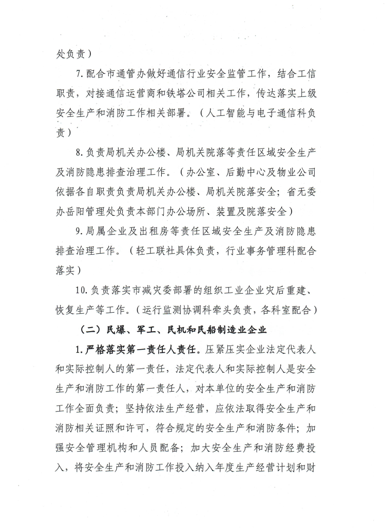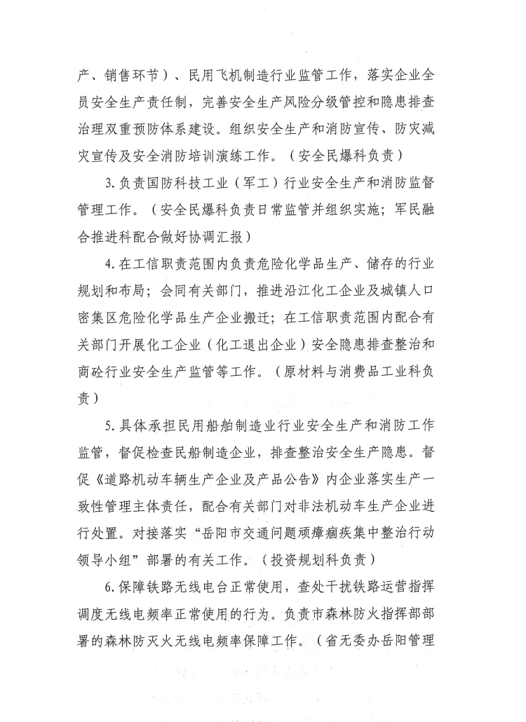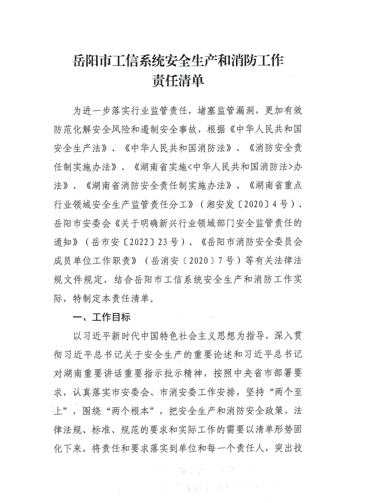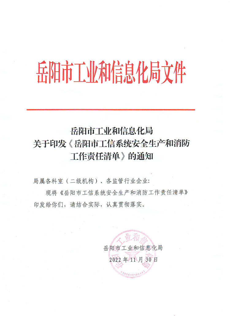 岳阳市工业和信息化局关于印发《岳阳市工信系统安全生产和消防工作责任清单》的通知