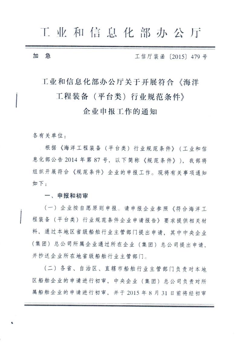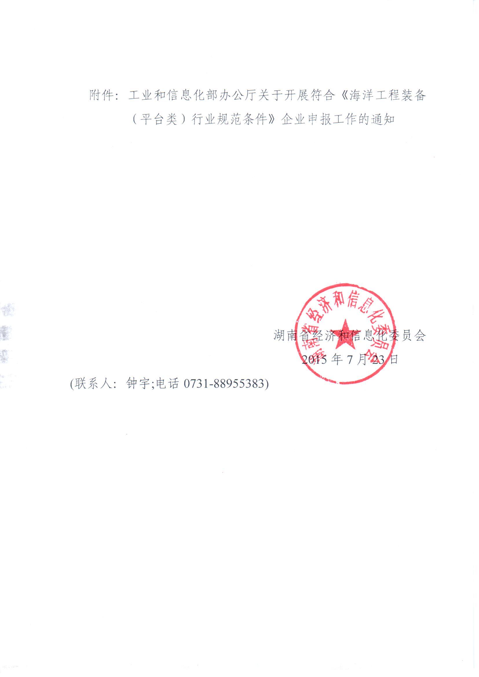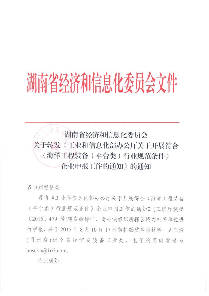 转发湖南省经济和信息化委员会《关于转发<工业和信息化部办公厅关于开展符合海洋工程装备(平台类)行业规范条件企业申报工作的通知>的通知》