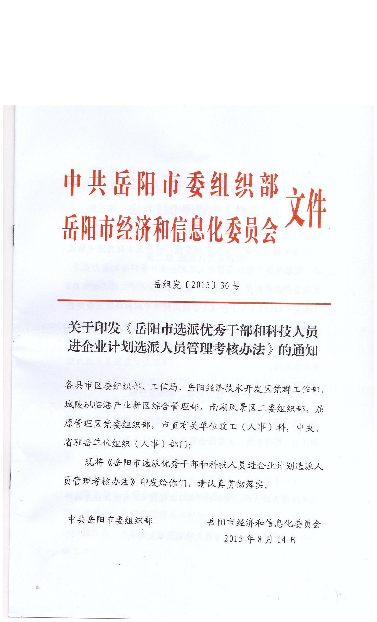 关于印发《岳阳市选派优秀干部和科技人员进企业计划选派人员管理考核办法》的通知
