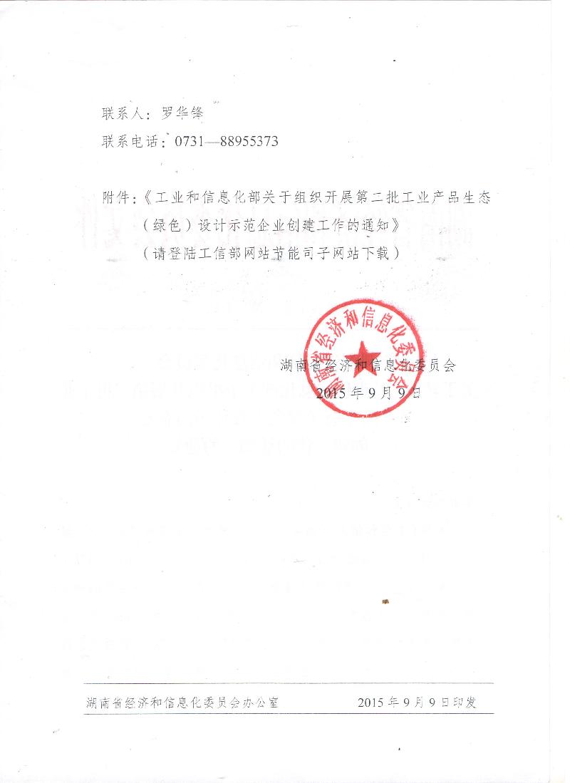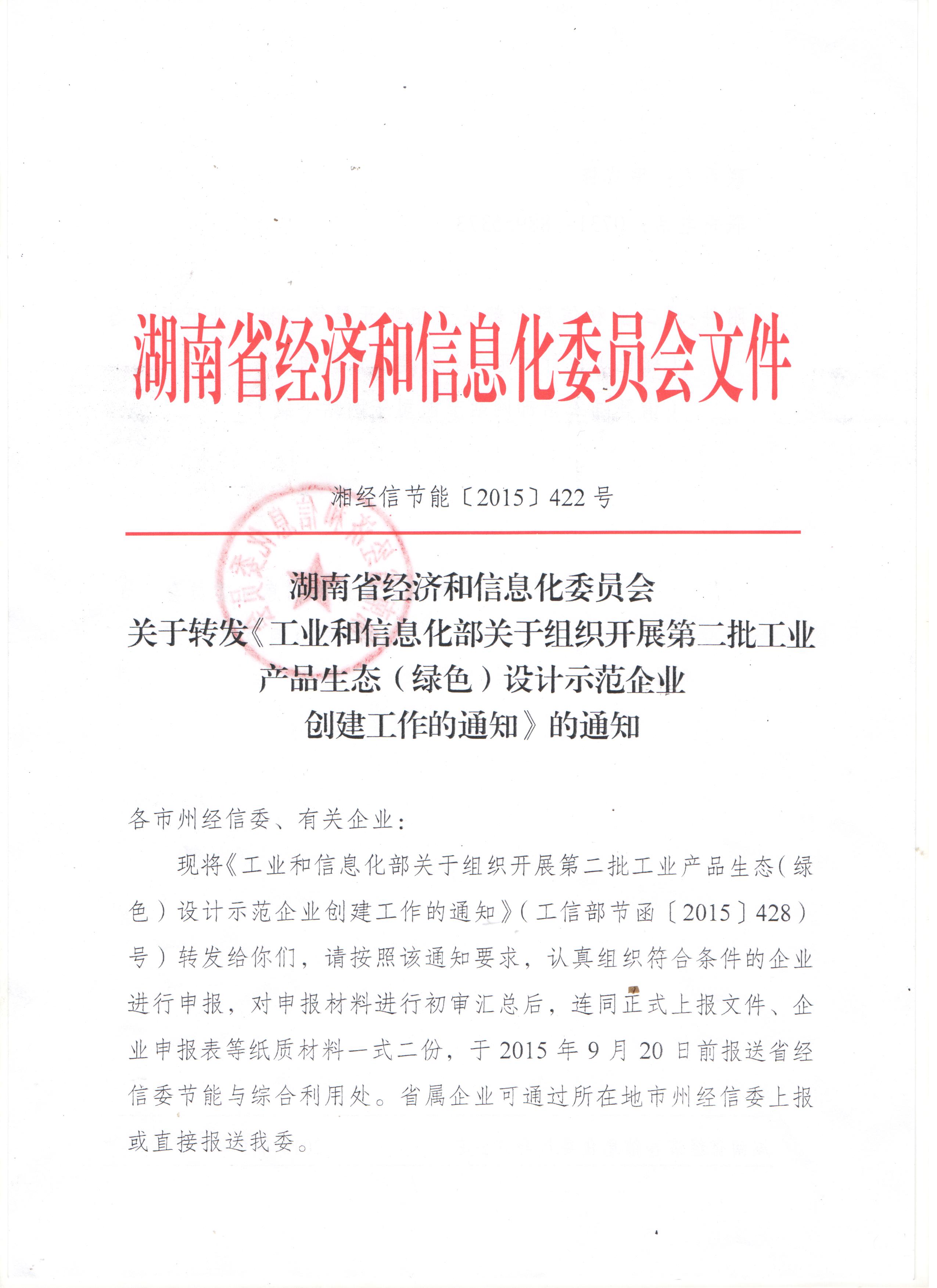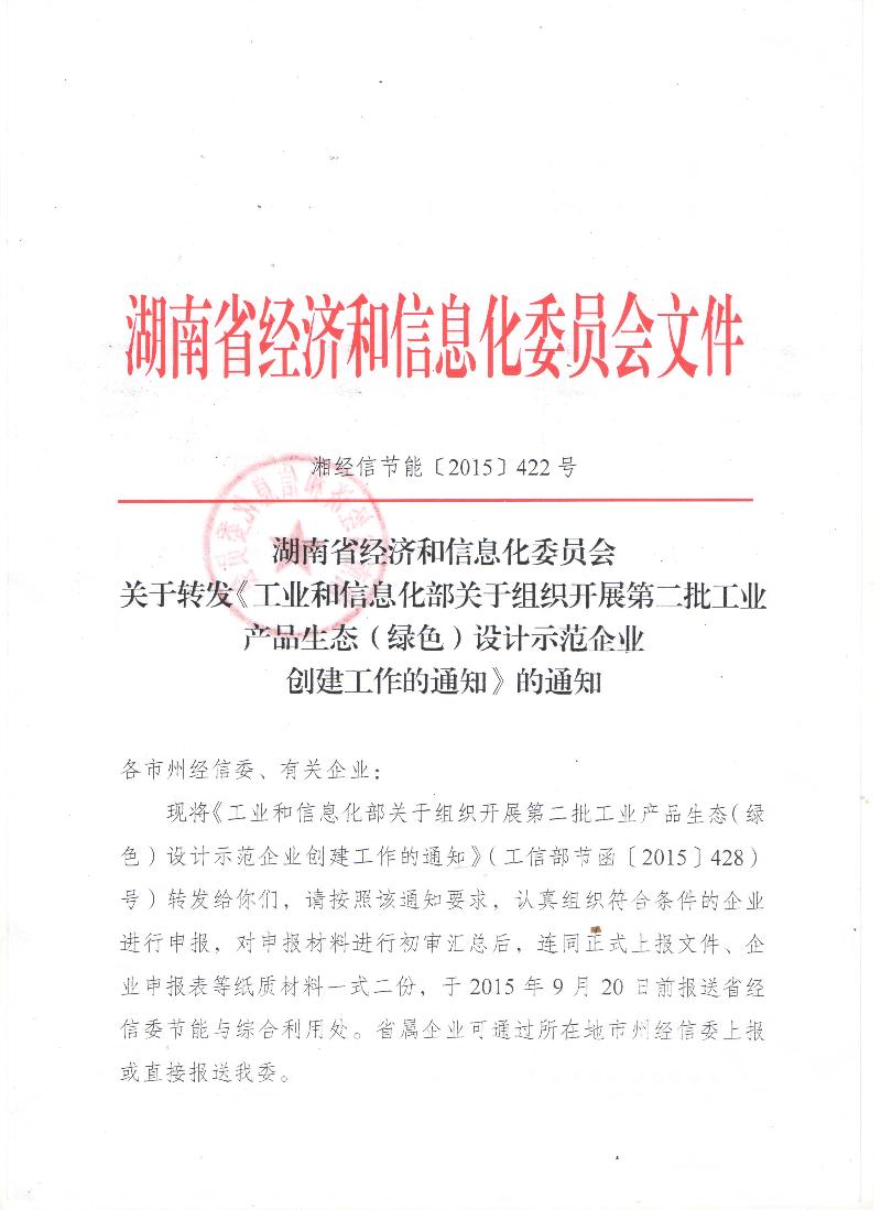 转发湖南省经济和信息化委员会关于转发《工业和信息化部关于组织开展第二批工业产品生态(绿色)设计示范企业创建工作的通知》的通知