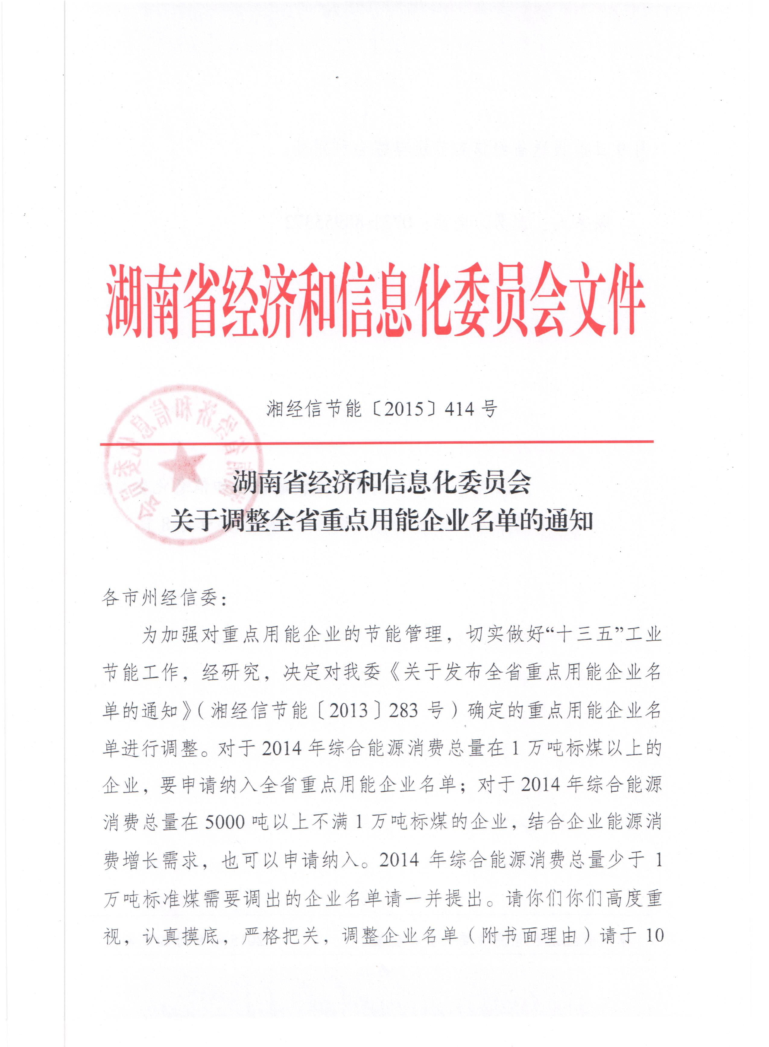 转发湖南省经济和信息化委员会《关于调整全省重点用能企业名单的通知》