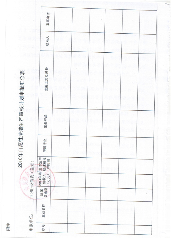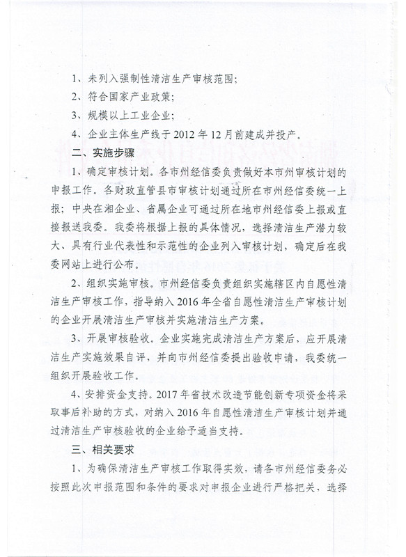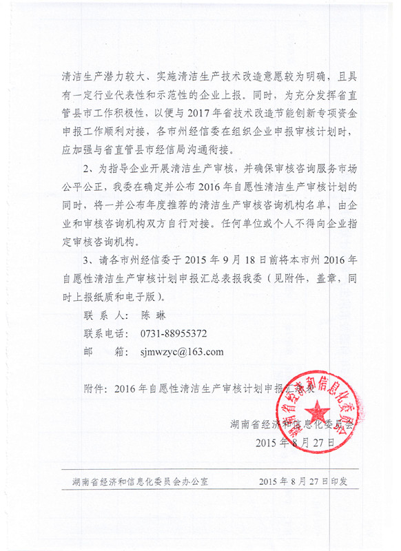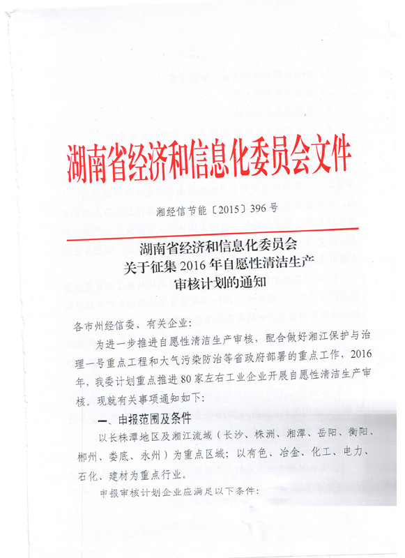 转发湖南省经济和信息化委员会《关于征集2016年自愿性清洁生产审核计划的通知》(湘经信节能【2015】396号)