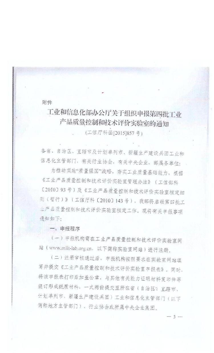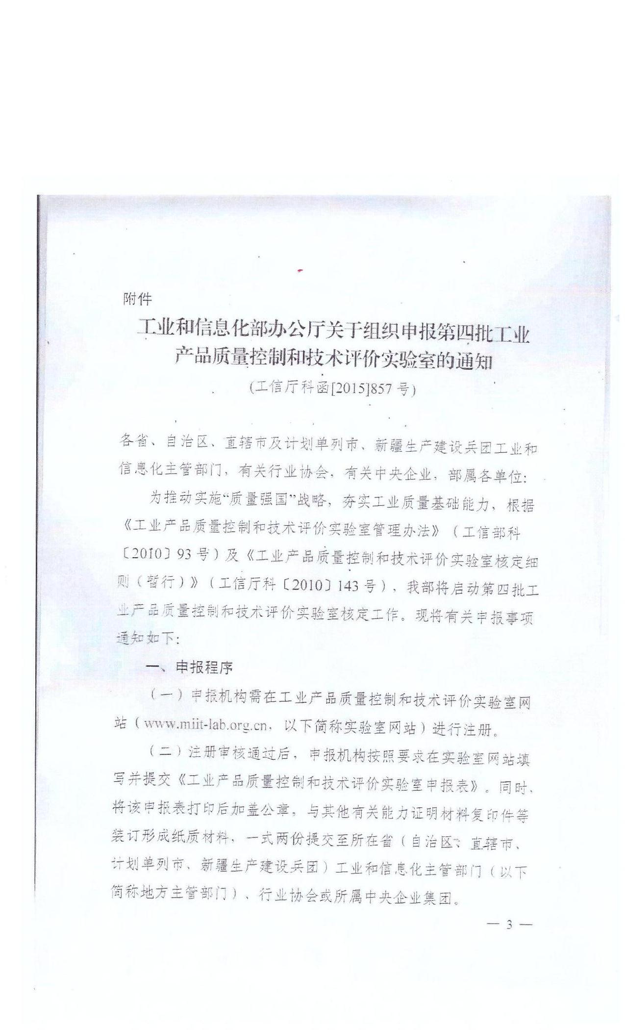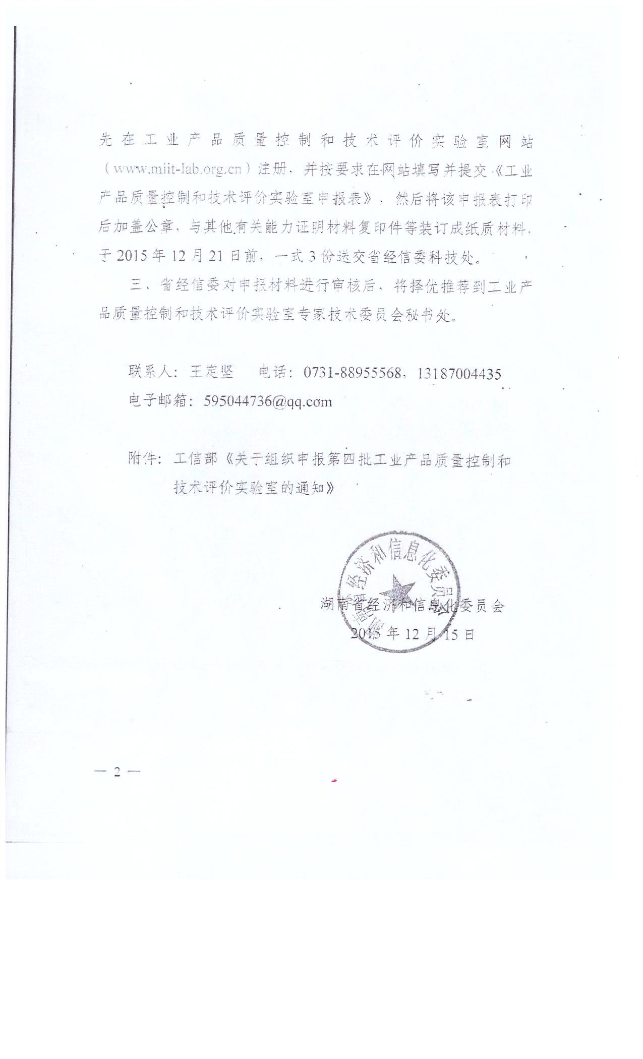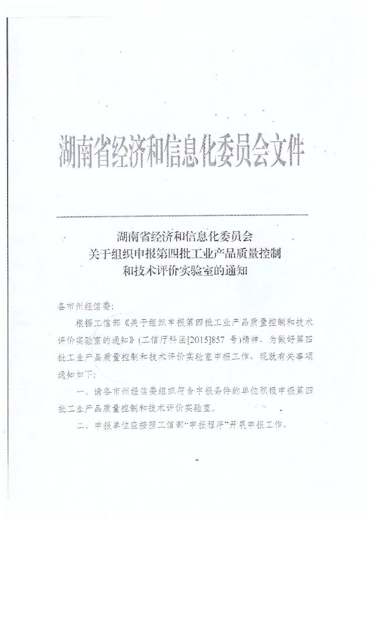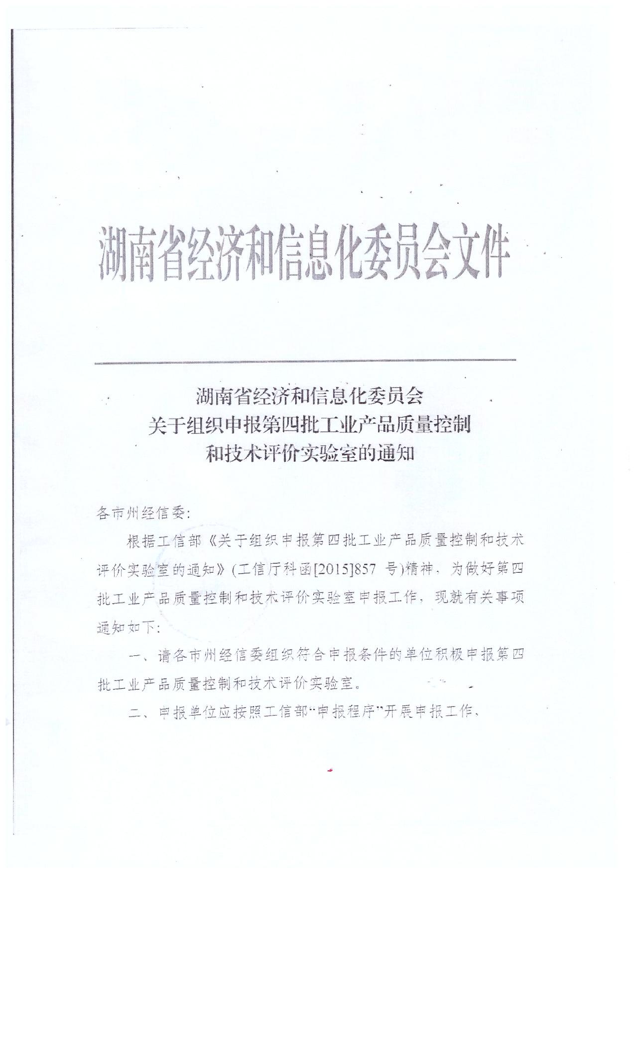 转发湖南省经济和信息化委员会《关于组织申报第四批工业产品质量控制和技术评价实验室的通知》
