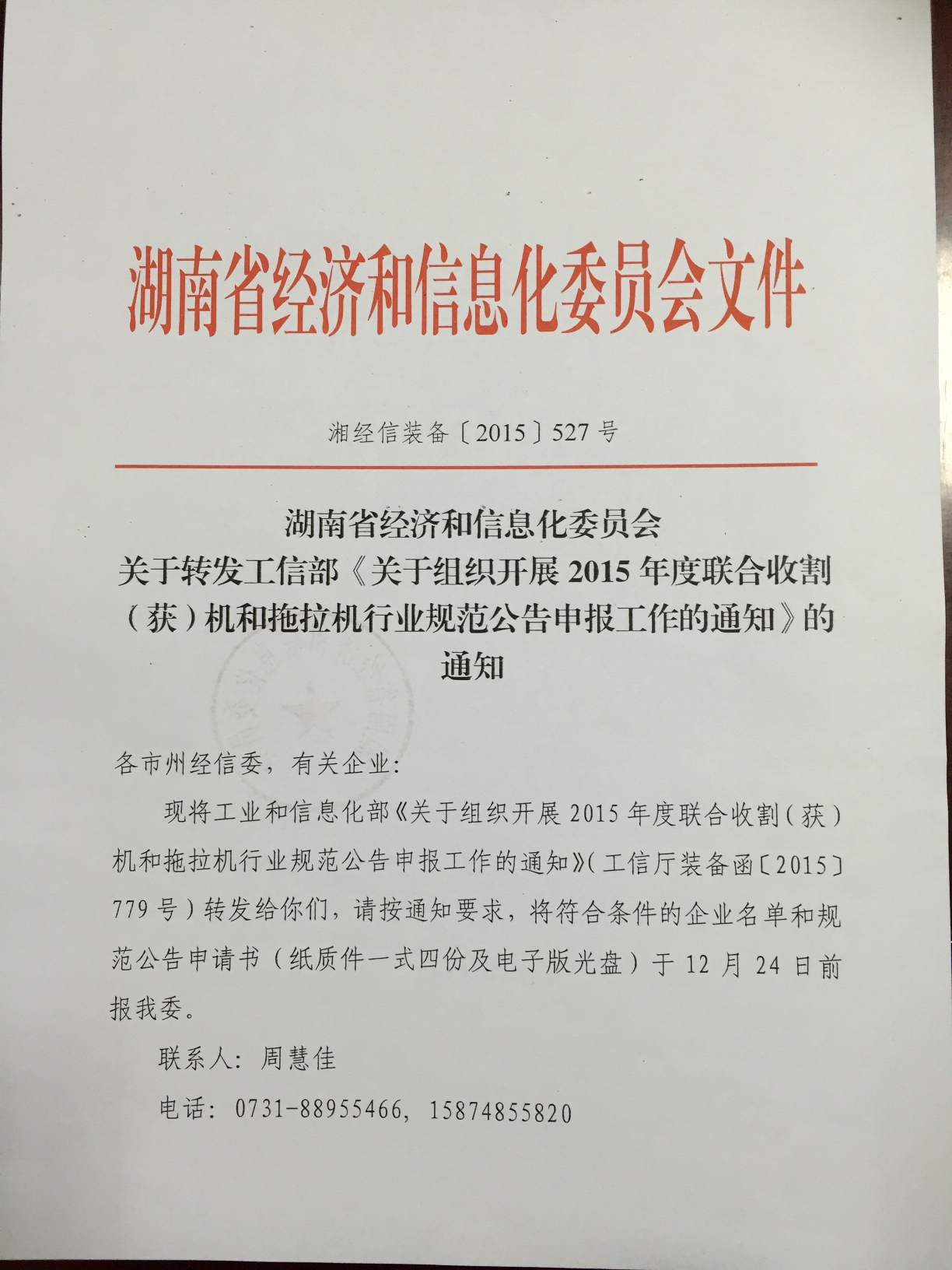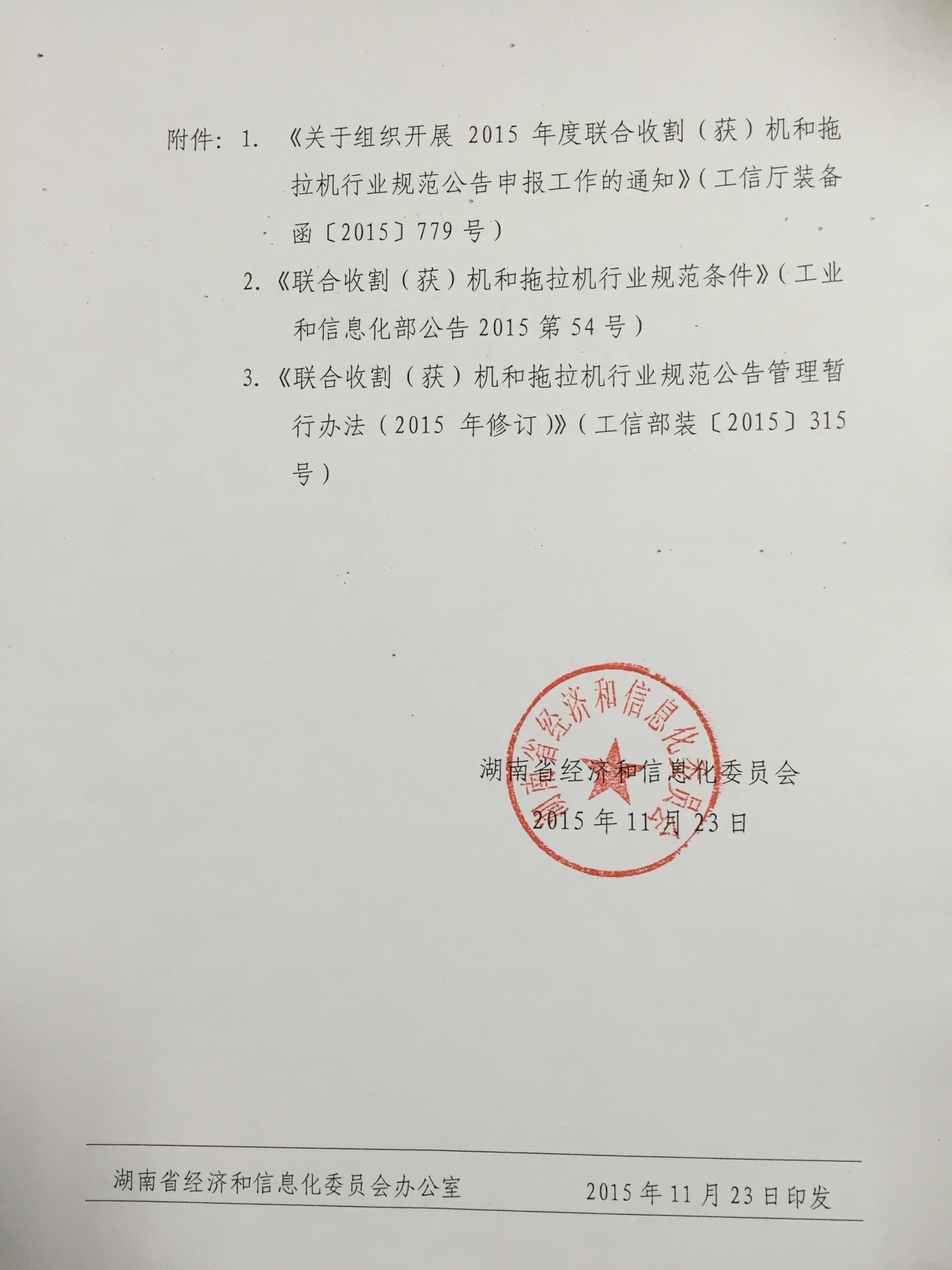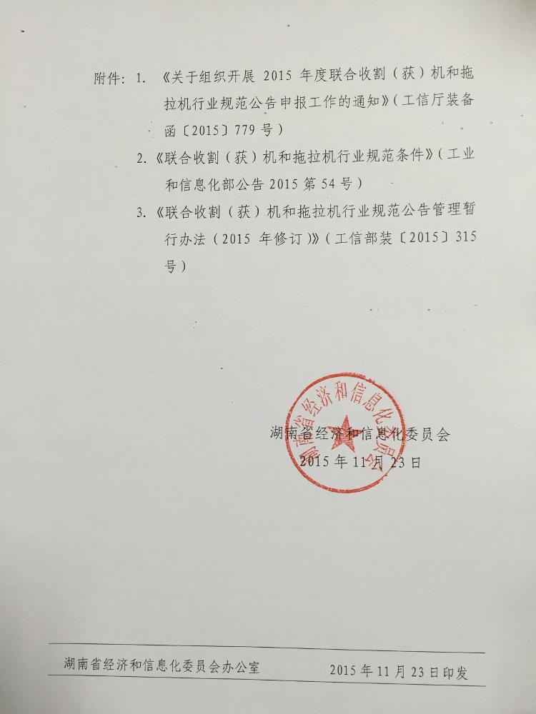 转发湖南省经济和信息化委员会关于转发工信部《关于组织开展2015年度联合收割(获)机和拖拉机行业规范公告申报工作的通知》的通知