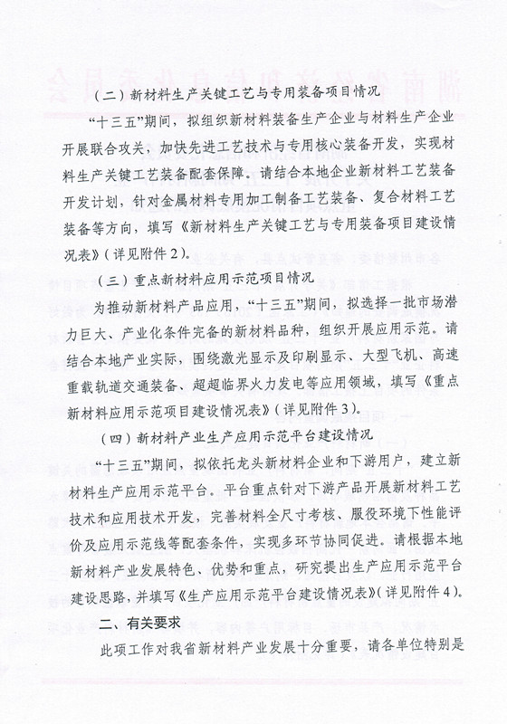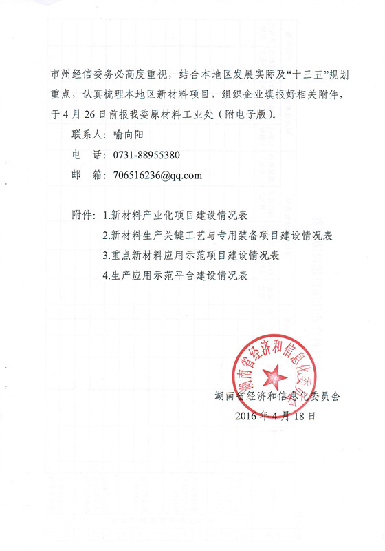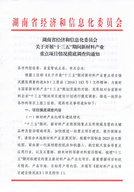 转发湖南省经济和信息化委员《关于开展“十三五”期间新材料产业重点项目情况摸底调查的通知》