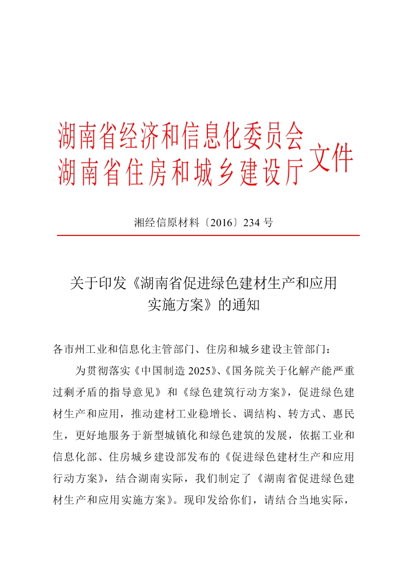 转发湖南省经济和信息化委员会关于印发《湖南省促进绿色建材生产和应用实施方案》的通知