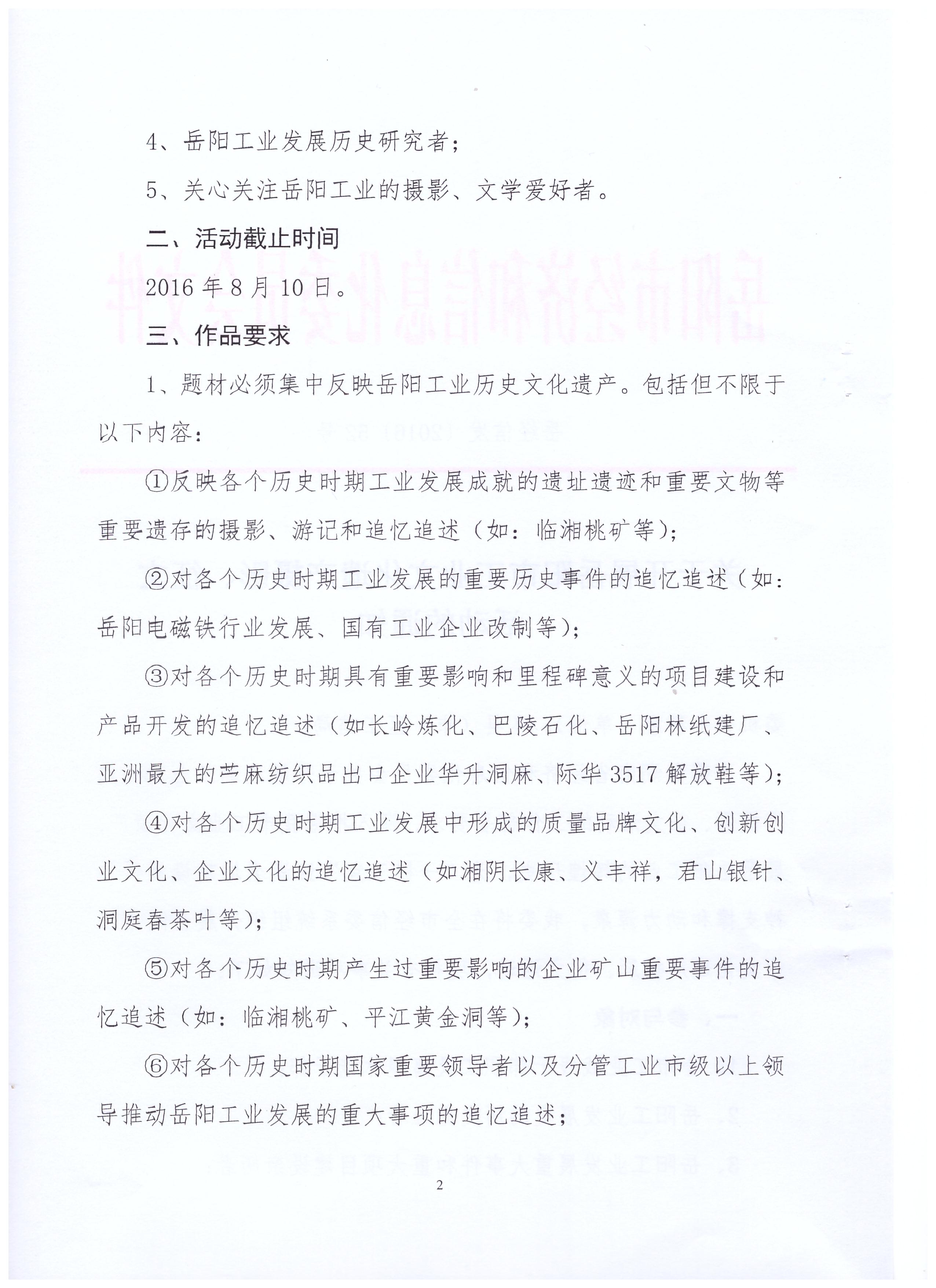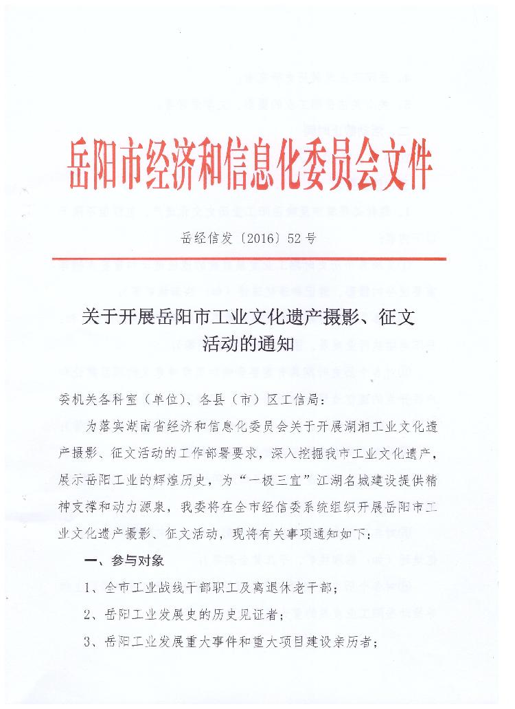 岳经信发〔2016〕52号 关于开展岳阳市工业文化遗产摄影、征文活动的通知.doc