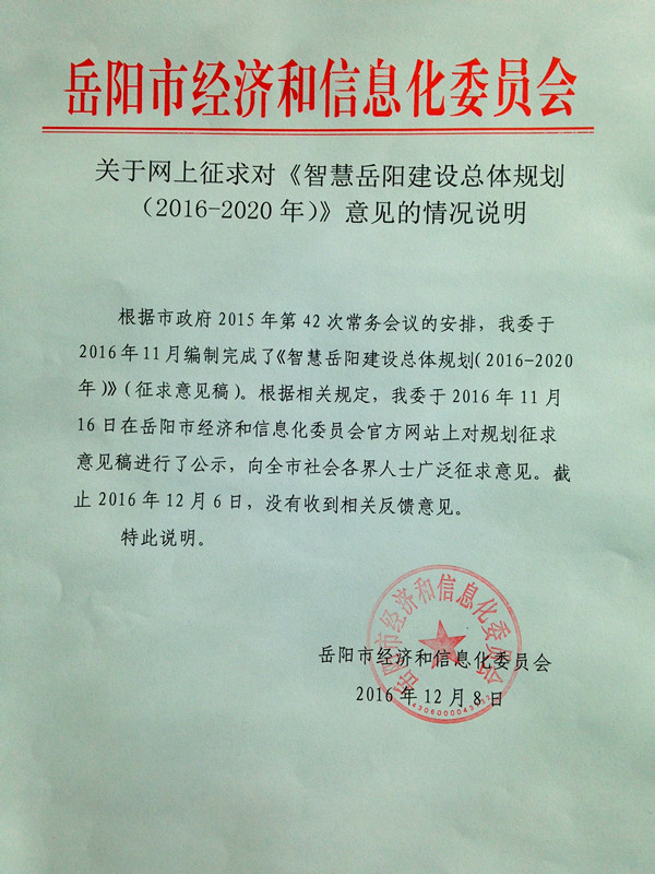 关于网上征求对《智慧岳阳建设总体规划(2016-2020年)》意见的情况说明