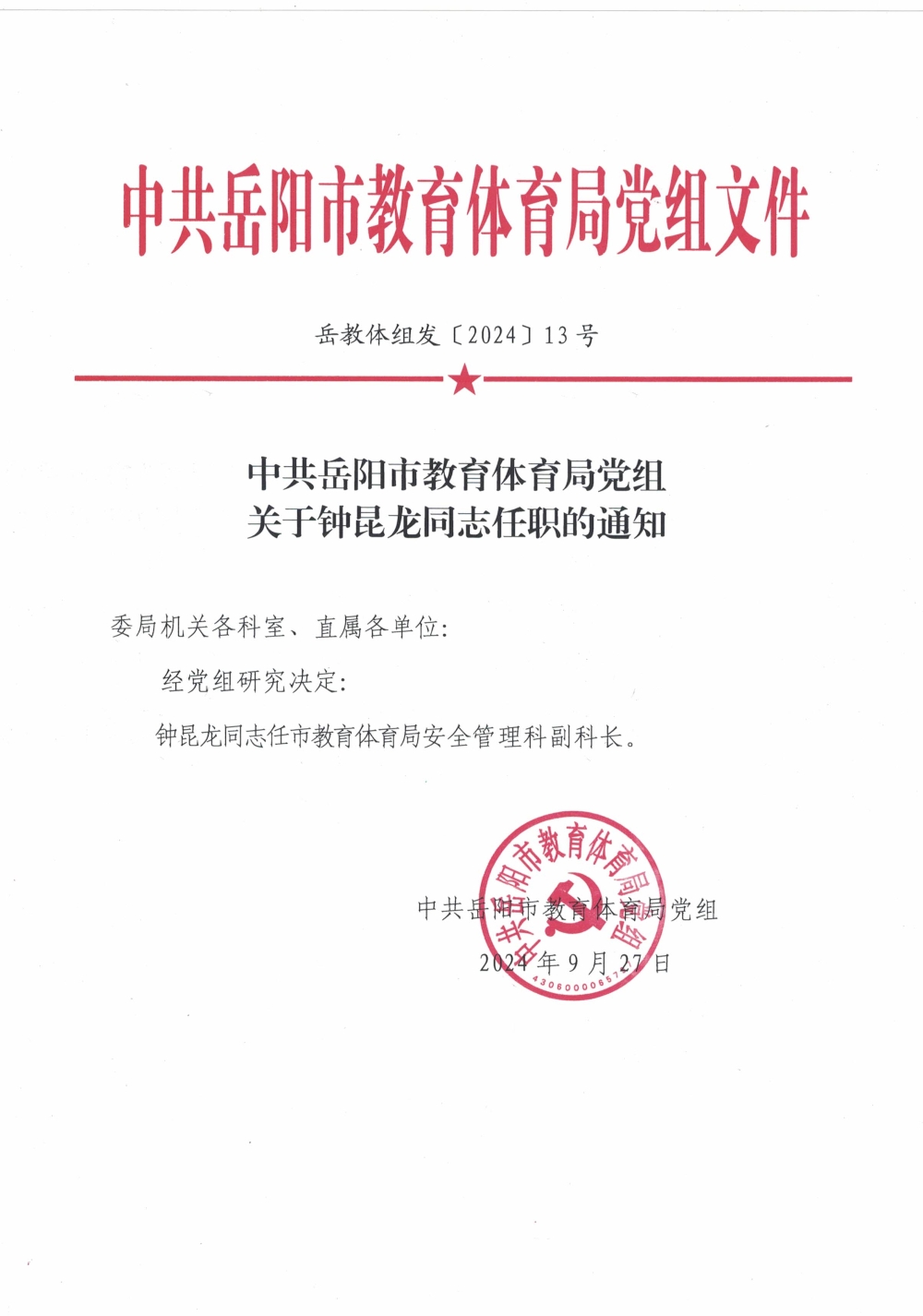 中共岳阳市教育体育局党组关于钟昆龙同志任职的通知