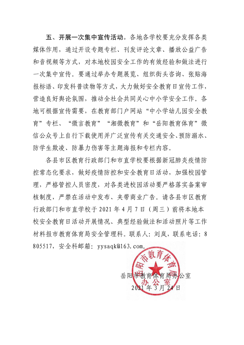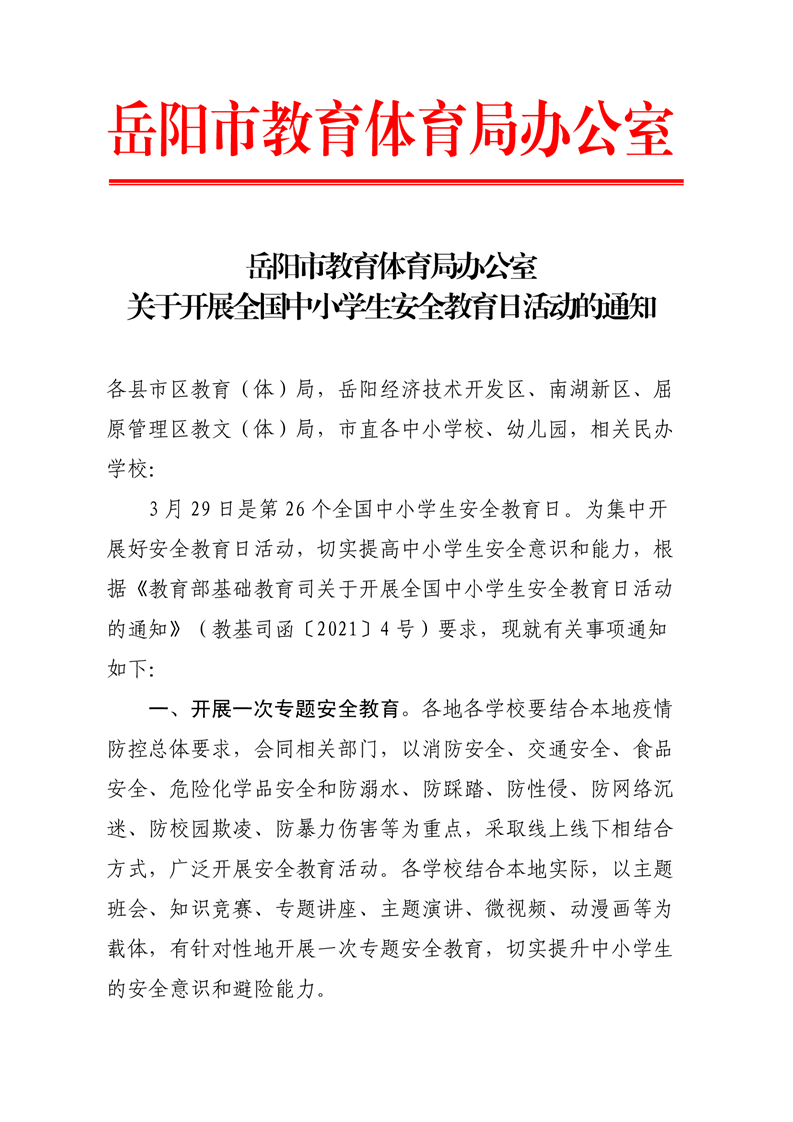 岳阳市教育体育局办公室关于开展全国中小学生安全教育日活动的通知