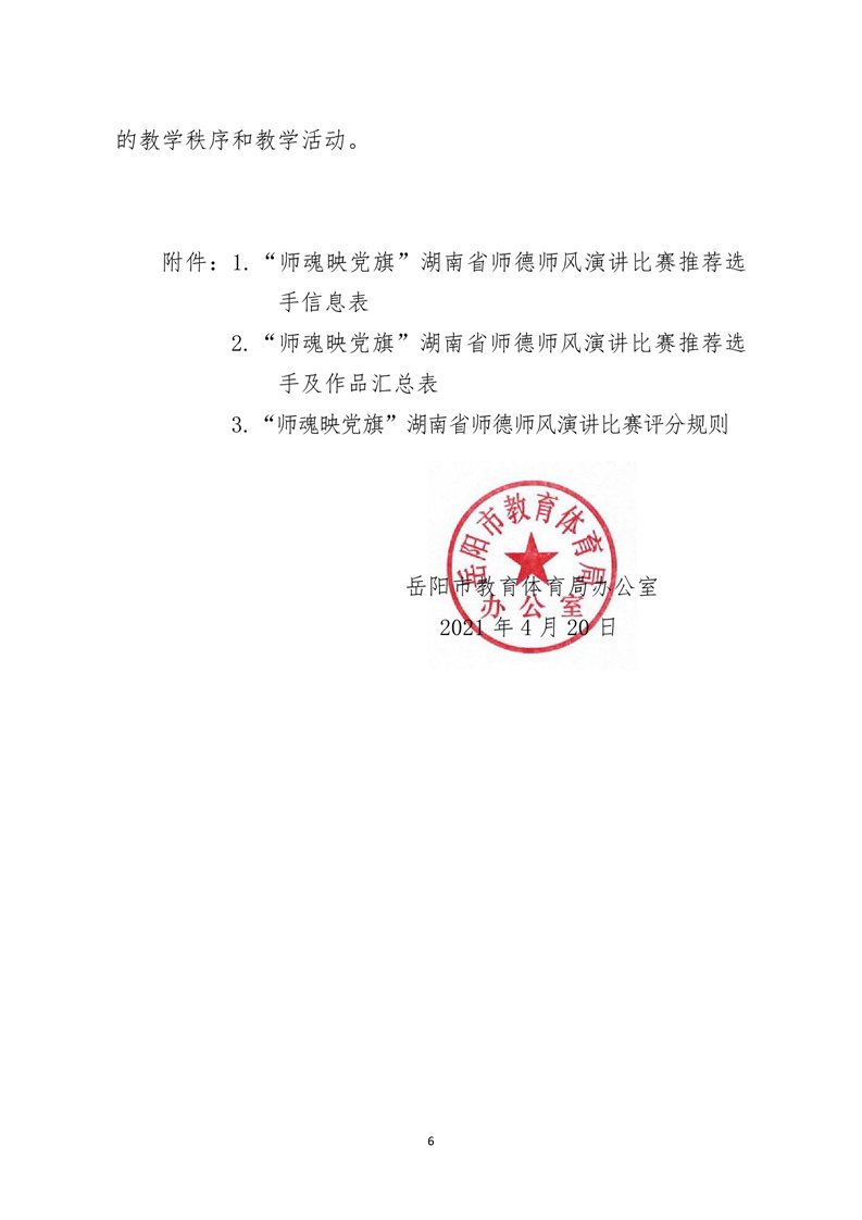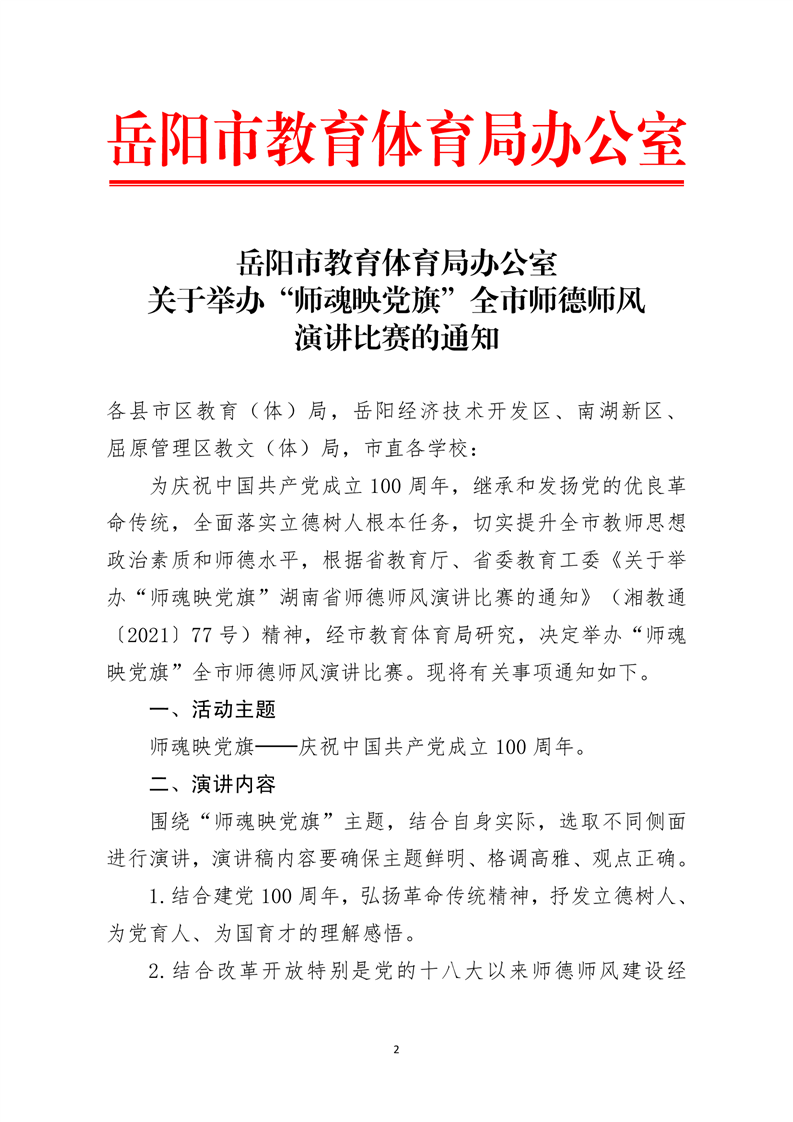 岳阳市教育体育局办公室关于举办“师魂映党旗”全市师德师风演讲比赛的通知