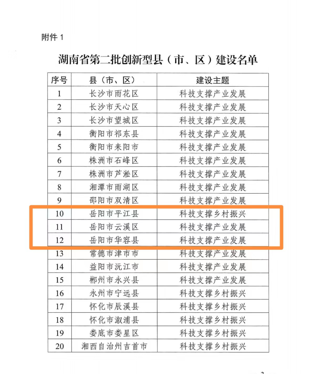 7月10日,从省科技厅发布《关于开展湖南省第二批创新型县(市、区)建设工作的通知》获悉,经市州推荐、形式审查、咨询评议、实地考察和公示,全省新确定20个县(市、区)为湖南省第二批创新型县(市、区)建设县(市、区)。我市平江县以“科技支撑乡村振兴”、云溪区和华容县分别以“科技支撑产业发展”为创建主题,成功申报入选。