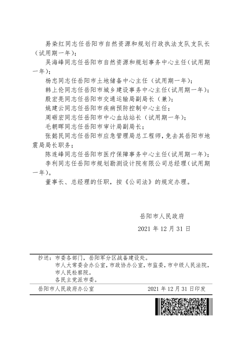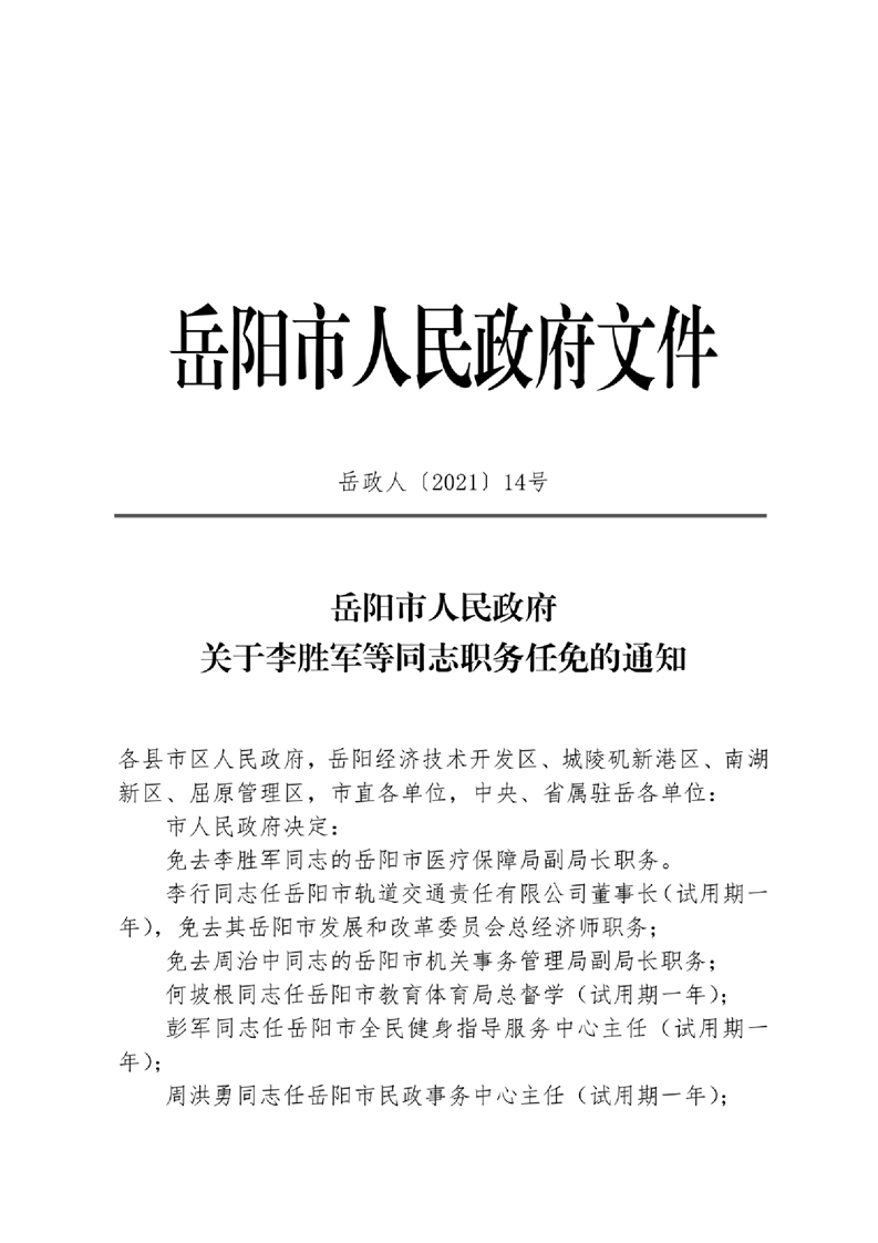 岳阳市人民政府关于李胜军等同志职务任免的通知(岳政人〔2021〕14号)