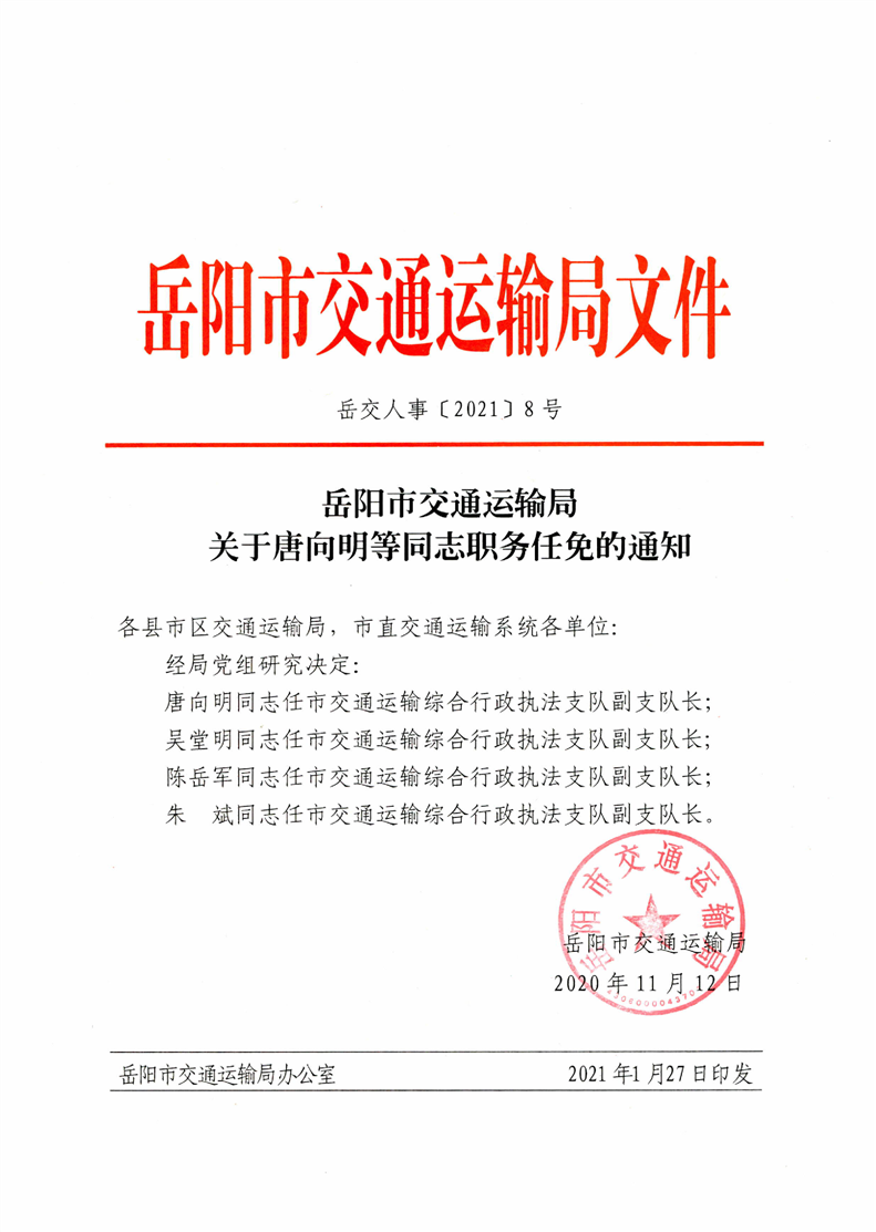 关于唐向明等同志职务任免的通知(岳交人事〔2021〕8号)