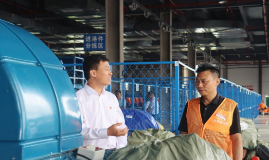 高博(左一)向汨罗市客货邮运营中心工作人员了解快递收发情况