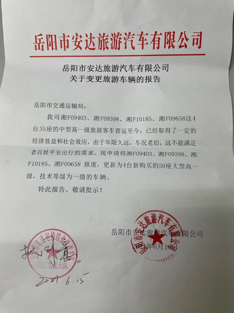 附件:岳阳市安达旅游汽车有限公司关于变更旅游车辆的报告