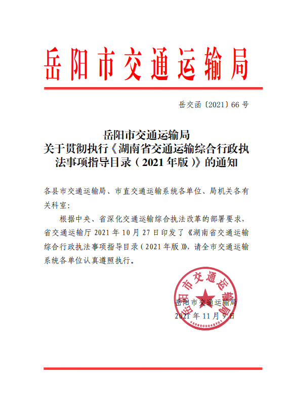 关于贯彻执行《湖南省交通运输综合行政执法事项指导目录(2021版)》的通知