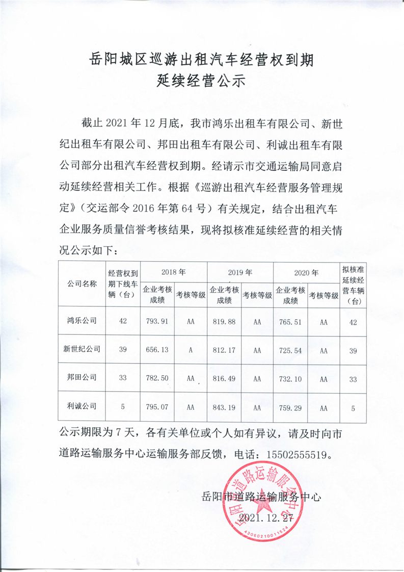 岳阳城区巡游出租汽车经营权到期延续经营公示