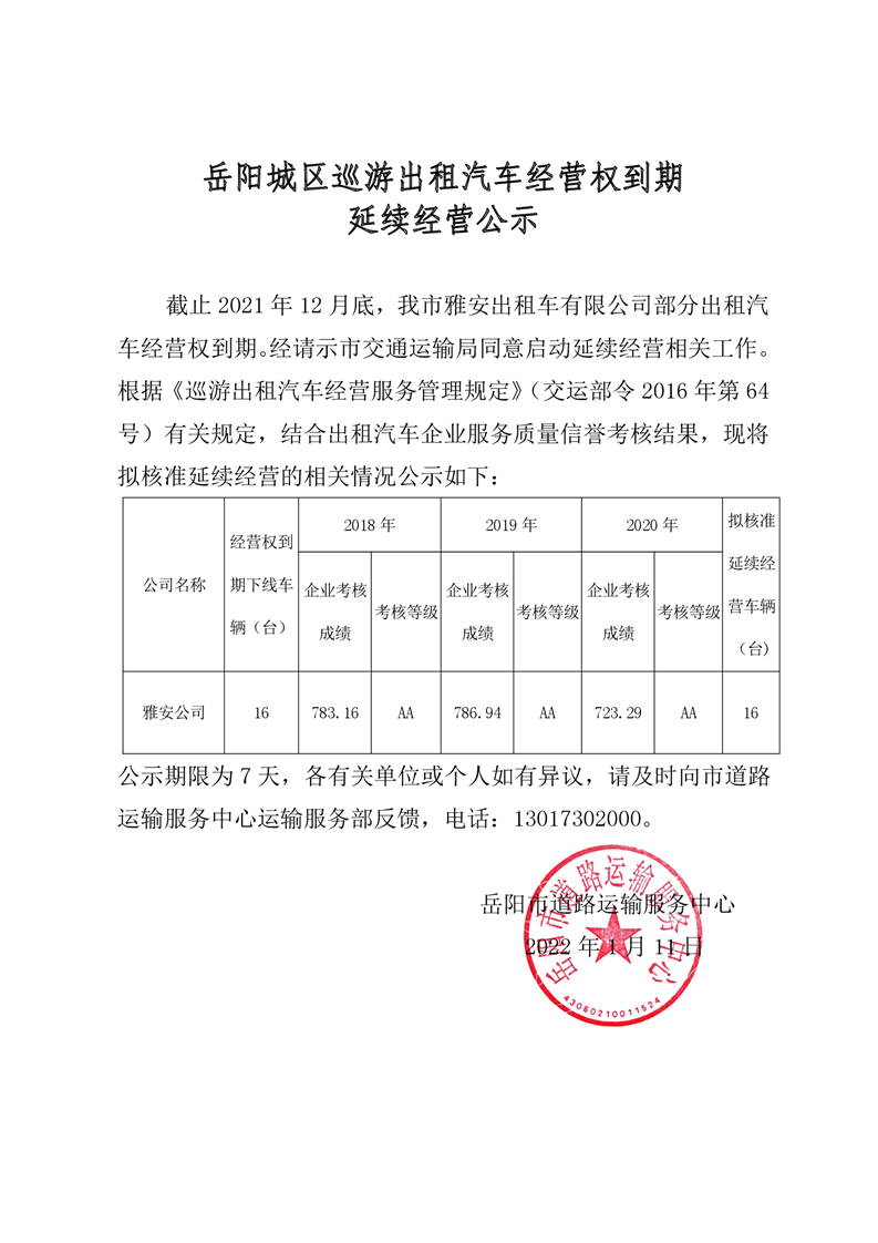岳阳城区巡游出租汽车经营权到期延续经营公示(二)