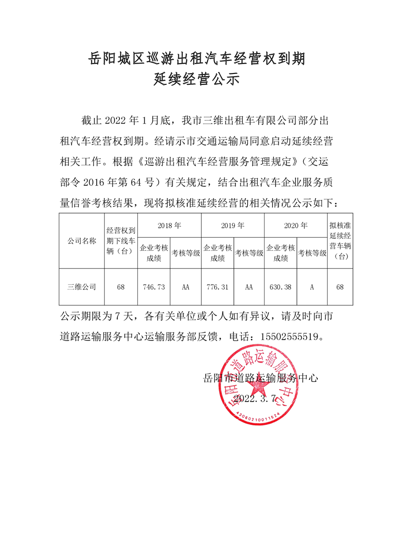 岳阳城区巡游出租汽车经营权到期延续经营公示(三)