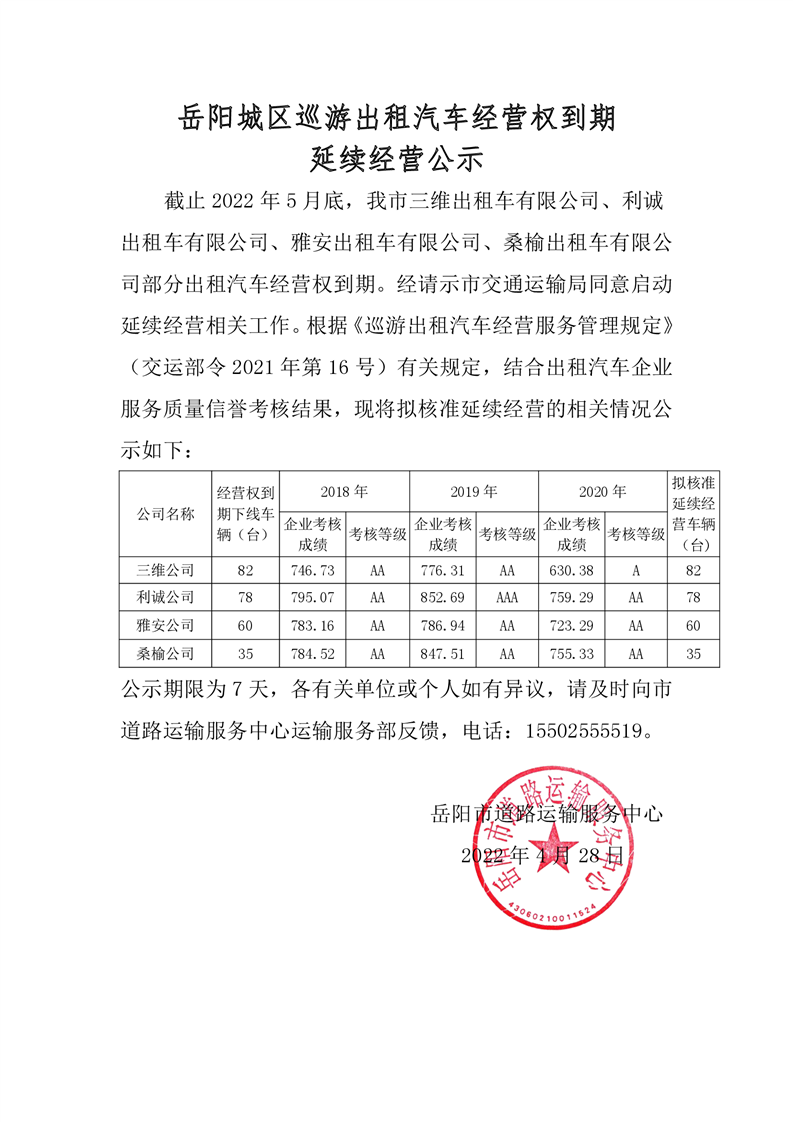 岳阳城区巡游出租汽车经营权到期延续经营公示(五)