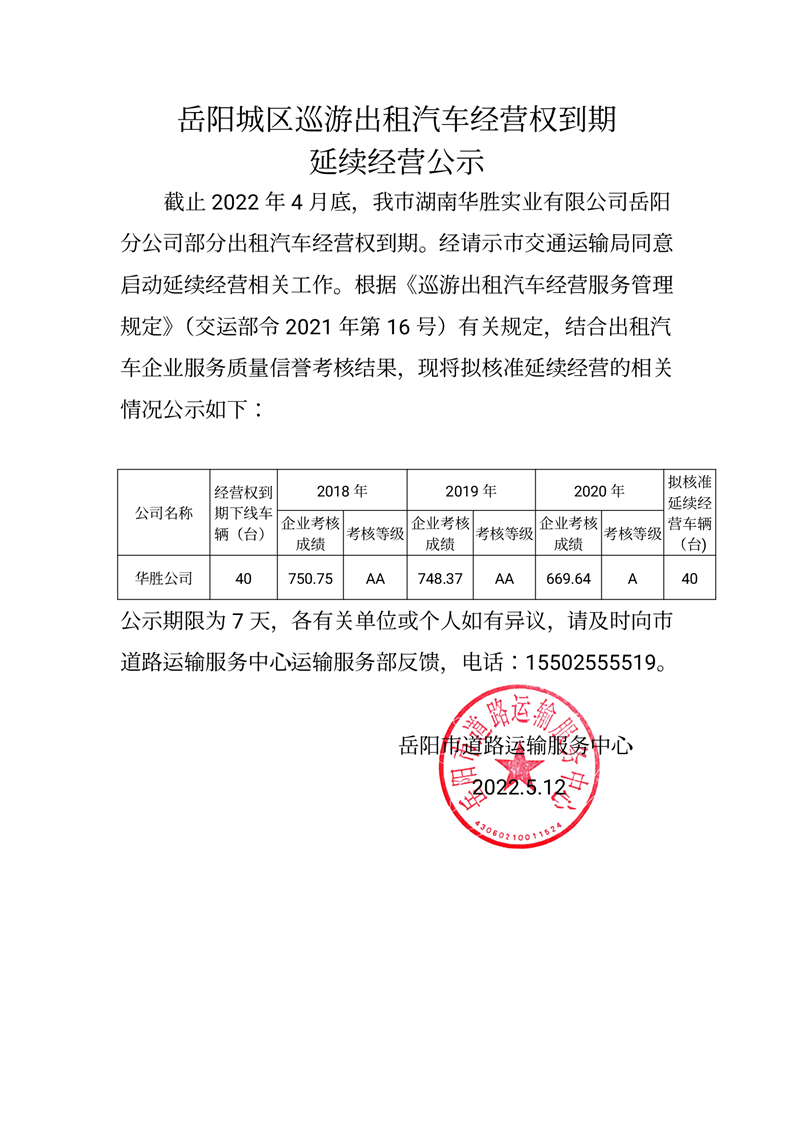 岳阳城区巡游出租汽车经营权到期延续经营公示(六)