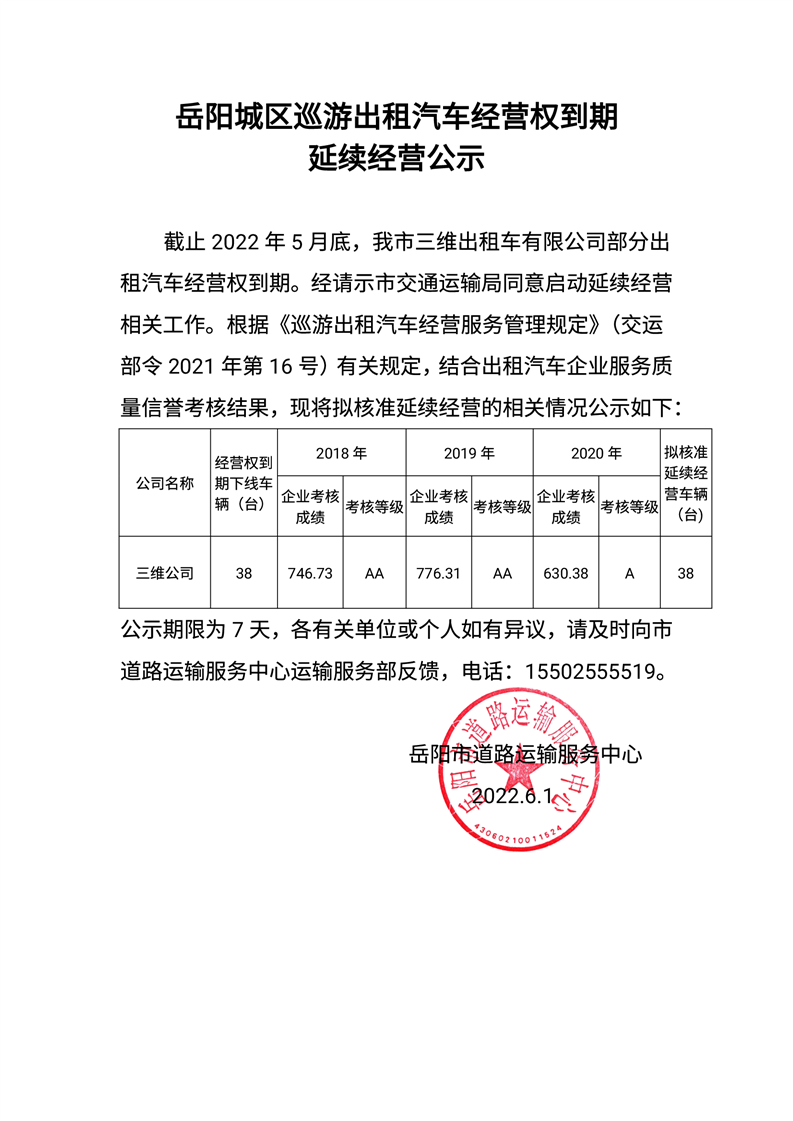 岳阳城区巡游出租汽车经营权到期延续经营公示(七)