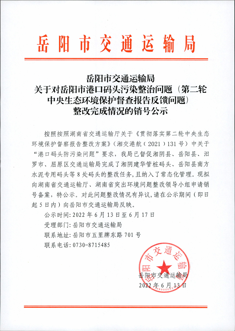 关于对岳阳市港口码头污染整治问题(第二轮中央生态环境保护督查报告反馈问题)整改完成情况的销号公示
