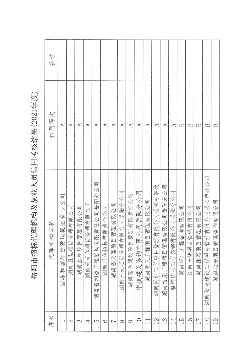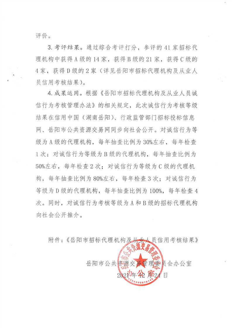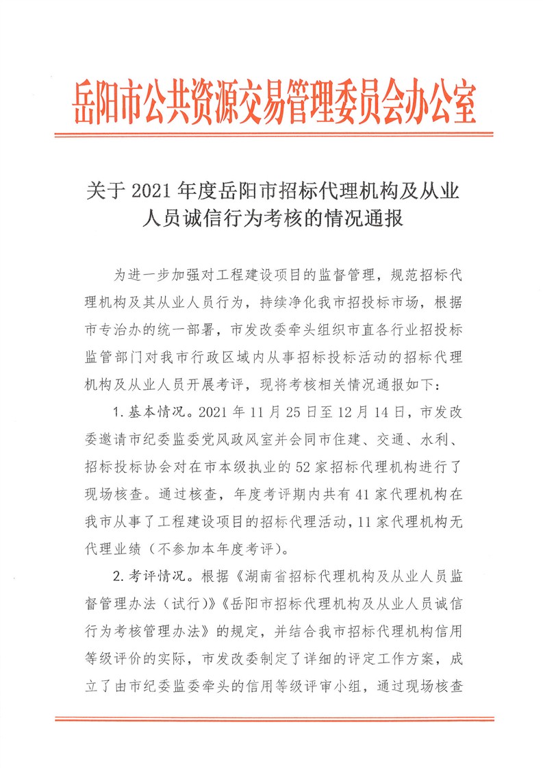 关于2021年度岳阳市招标代理机构及从业人员诚信行为考核的情况通报