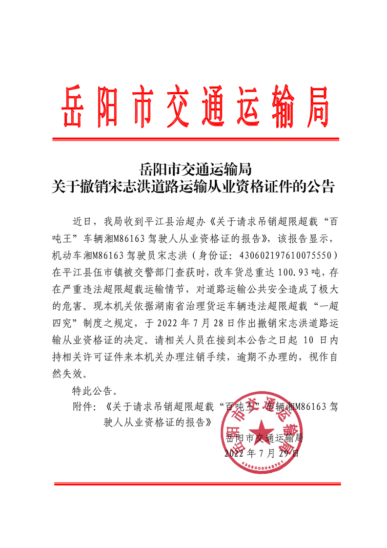 岳阳市交通运输局关于撤销宋志洪道路运输从业资格证件的公告