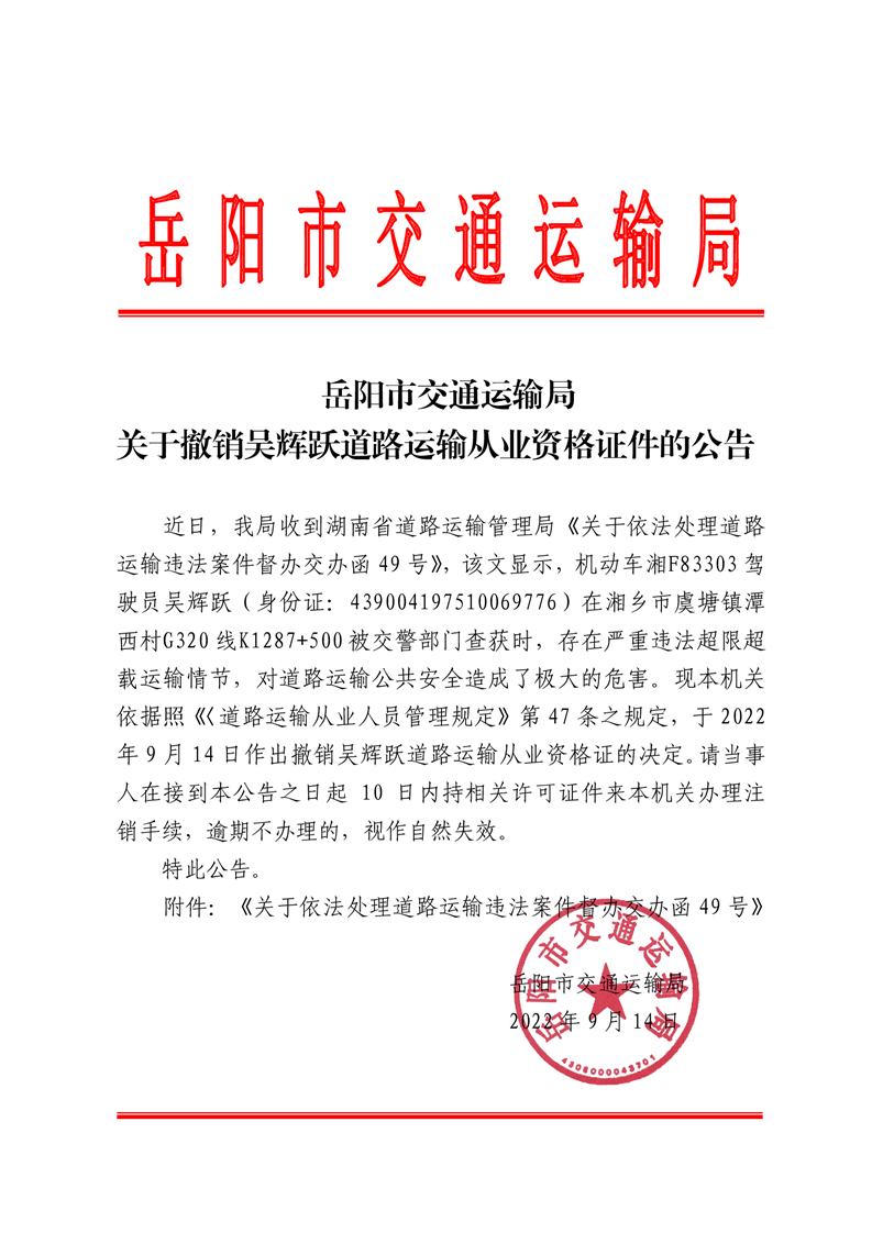 岳阳市交通运输局关于撤销吴辉跃道路运输从业资格证件的公告