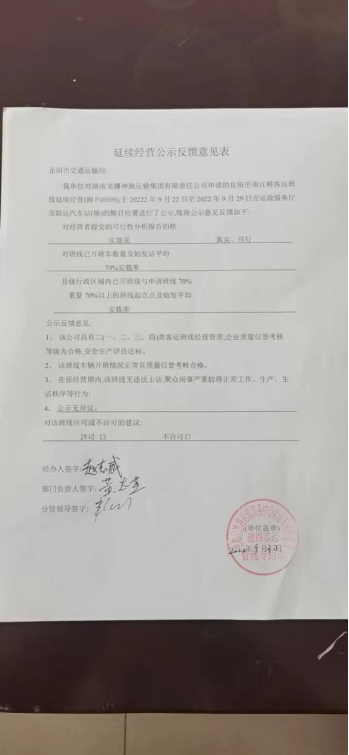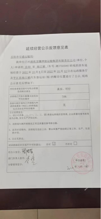 关于神驰岳阳至南江桥湘F50599延续经营的公示