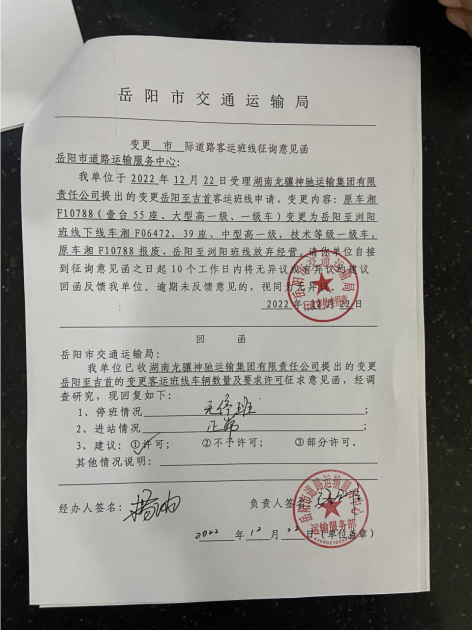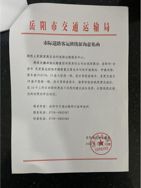 现将我局受理的道路旅客运输相关事项进行公示,如有意见或建议的,请于公示之日起5个工作日内书面向我局行政审批科反映,并在反映材料上署名,所反映的内容必须真实。