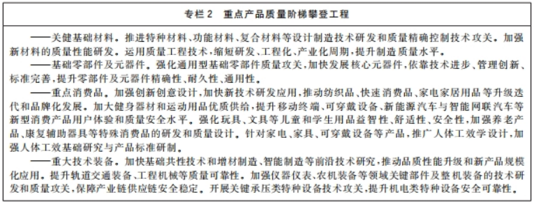 (六)强化产业基础质量支撑。聚焦产业基础质量短板,分行业实施产业基础质量提升工程,加强重点领域产业基础质量攻关,实现工程化突破和产业化应用。开展材料质量提升关键共性技术研发和应用验证,提高材料质量稳定性、一致性、适用性水平。改进基础零部件与元器件性能指标,提升可靠性、耐久性、先进性。推进基础制造工艺与质量管理、数字智能、网络技术深度融合,提高生产制造敏捷度和精益性。支持通用基础软件、工业软件、平台软件、应用软件工程化开发,实现工业质量分析与控制软件关键技术突破。加强技术创新、标准研制、计量测试、合格评定、知识产权、工业数据等产业技术基础能力建设,加快产业基础高级化进程。