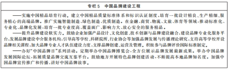 ——品牌建设取得更大进展。品牌培育、发展、壮大的促进机制和支持制度更加健全,品牌建设水平显著提高,企业争创品牌、大众信赖品牌的社会氛围更加浓厚,品质卓越、特色鲜明的品牌领军企业持续涌现,形成一大批质量过硬、优势明显的中国品牌。