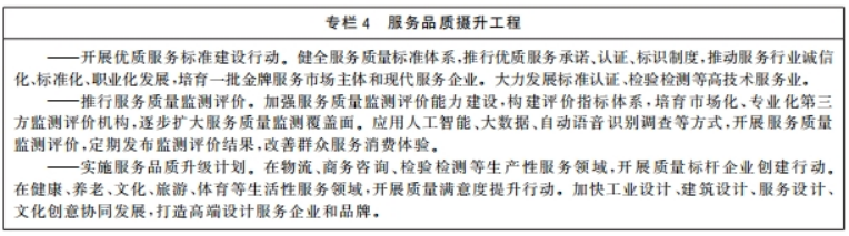 (十七)促进生活服务品质升级。大力发展大众餐饮服务,提高质量安全水平。创新丰富家政服务,培育优质服务品牌。促进物业管理、房屋租赁服务专业化、规范化发展。提升旅游管理和服务水平,规范旅游市场秩序,改善旅游消费体验,打造乡村旅游、康养旅游、红色旅游等精品项目。提升面向居家生活、户外旅游等的应急救援服务能力。大力发展公共交通,引导网约出租车、定制公交等个性化出行服务规范发展。推动航空公司和机场全面建立旅客服务质量管理体系,提高航空服务能力和品质。积极培育体育赛事活动、社区健身等服务项目,提升公共体育场馆开放服务品质。促进网络购物、移动支付等新模式规范有序发展,鼓励超市、电商平台等零售业态多元化融合发展。支持有条件的地方建设新型消费体验中心,开展多样化体验活动。加强生活服务质量监管,保障人民群众享有高品质生活。