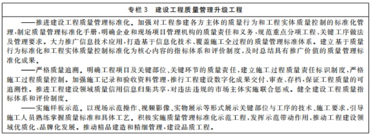(十五)打造中国建造升级版。坚持百年大计、质量第一,树立全生命周期建设发展理念,构建现代工程建设质量管理体系,打造中国建造品牌。完善勘察、设计、监理、造价等工程咨询服务技术标准,鼓励发展全过程工程咨询和专业化服务。完善工程设计方案审查论证机制,突出地域特征、民族特点、时代风貌,提供质量优良、安全耐久、环境协调、社会认可的工程设计产品。加大先进建造技术前瞻性研究力度和研发投入,加快建筑信息模型等数字化技术研发和集成应用,创新开展工程建设工法研发、评审、推广。加强先进质量管理模式和方法高水平应用,打造品质工程标杆。推广先进建造设备和智能建造方式,提升建设工程的质量和安全性能。大力发展绿色建筑,深入推进可再生能源、资源建筑应用,实现工程建设全过程低碳环保、节能减排。