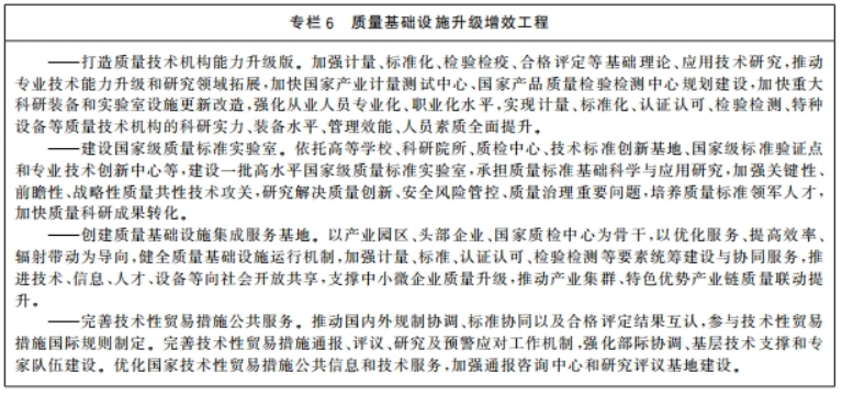 ——质量基础设施更加现代高效。质量基础设施管理体制机制更加健全、布局更加合理,计量、标准、认证认可、检验检测等实现更高水平协同发展,建成若干国家级质量标准实验室,打造一批高效实用的质量基础设施集成服务基地。