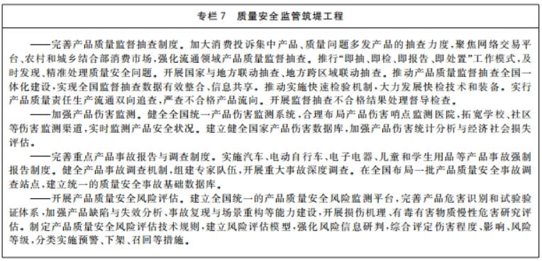 (二十七)优化质量监管效能。健全以“双随机、一公开”监管和“互联网+监管”为基本手段、以重点监管为补充、以信用监管为基础的新型监管机制。创新质量监管方式,完善市场准入制度,深化工业产品生产许可证和强制性认证制度改革,分类放宽一般工业产品和服务业准入限制,强化事前事中事后全链条监管。对涉及人民群众身体健康和生命财产安全、公共安全、生态环境安全的产品以及重点服务领域,依法实施严格监管。完善产品质量监督抽查制度,加强工业品和消费品质量监督检查,推动实现生产流通、线上线下一体化抽查,探索建立全国联动抽查机制,对重点产品实施全国企业抽查全覆盖,强化监督抽查结果处理。建立健全产品质量安全风险监控机制,完善产品伤害监测体系,开展质量安全风险识别、评估和处置。建立健全产品质量安全事故强制报告制度,开展重大质量安全事故调查与处理。健全产品召回管理体制机制,加强召回技术支撑,强化缺陷产品召回管理。构建重点产品质量安全追溯体系,完善质量安全追溯标准,加强数据开放共享,形成来源可查、去向可追、责任可究的质量安全追溯链条。加强产品防伪监督管理。建立质量安全“沙盒监管”制度,为新产品新业态发展提供容错纠错空间。加强市场秩序综合治理,营造公平竞争的市场环境,促进质量竞争、优胜劣汰。严格进出口商品质量安全检验监管,持续完善进出口商品质量安全风险预警和快速反应监管机制。加大对城乡结合部、农村等重点区域假冒伪劣的打击力度。强化网络平台销售商品质量监管,健全跨地区跨行业监管协调联动机制,推进线上线下一体化监管。