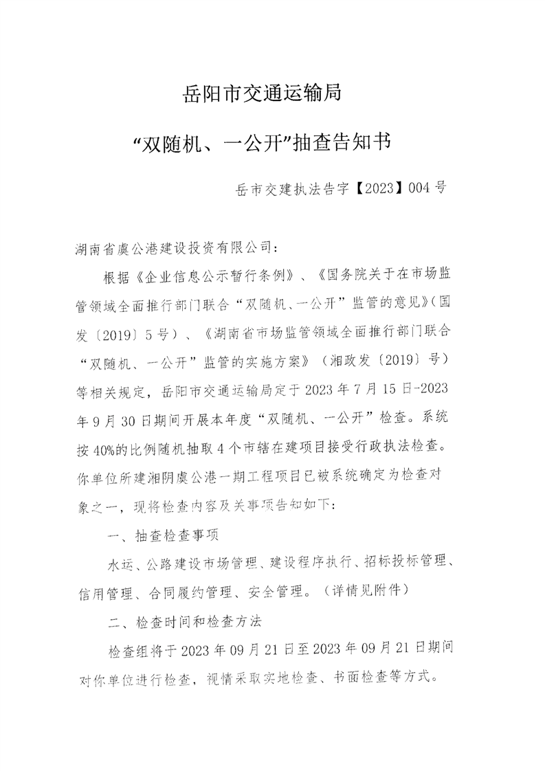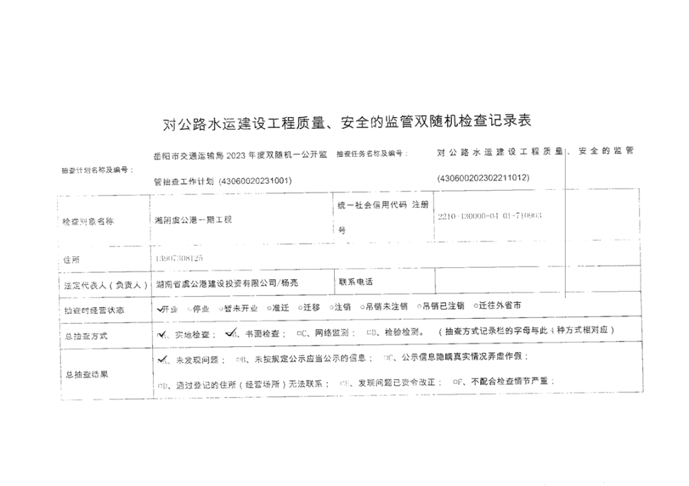 湘阴虞公港一期双随机一公开抽查结果公示