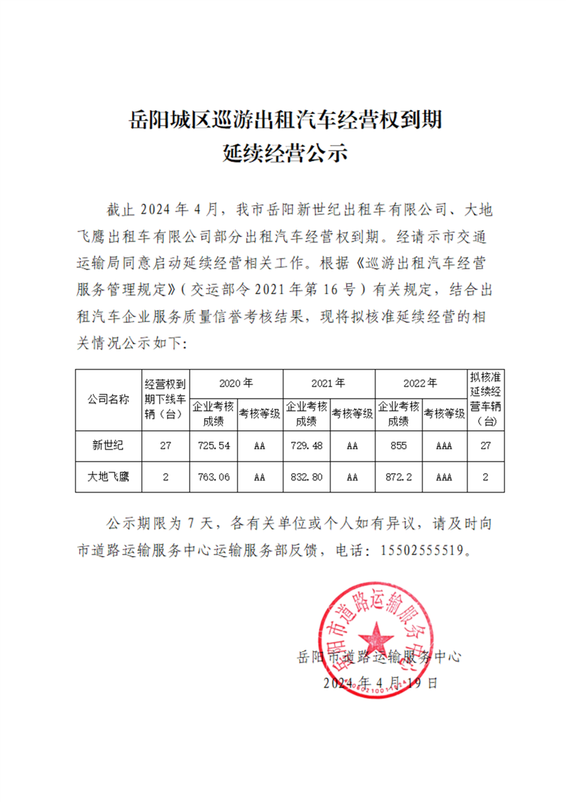 岳阳城区巡游出租汽车经营权到期延续经营公示(4月19日)