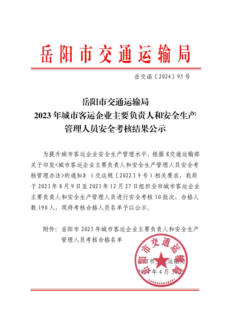 关于2023年城市客运企业主要负责人和安全生产管理人员安全考核结果公示