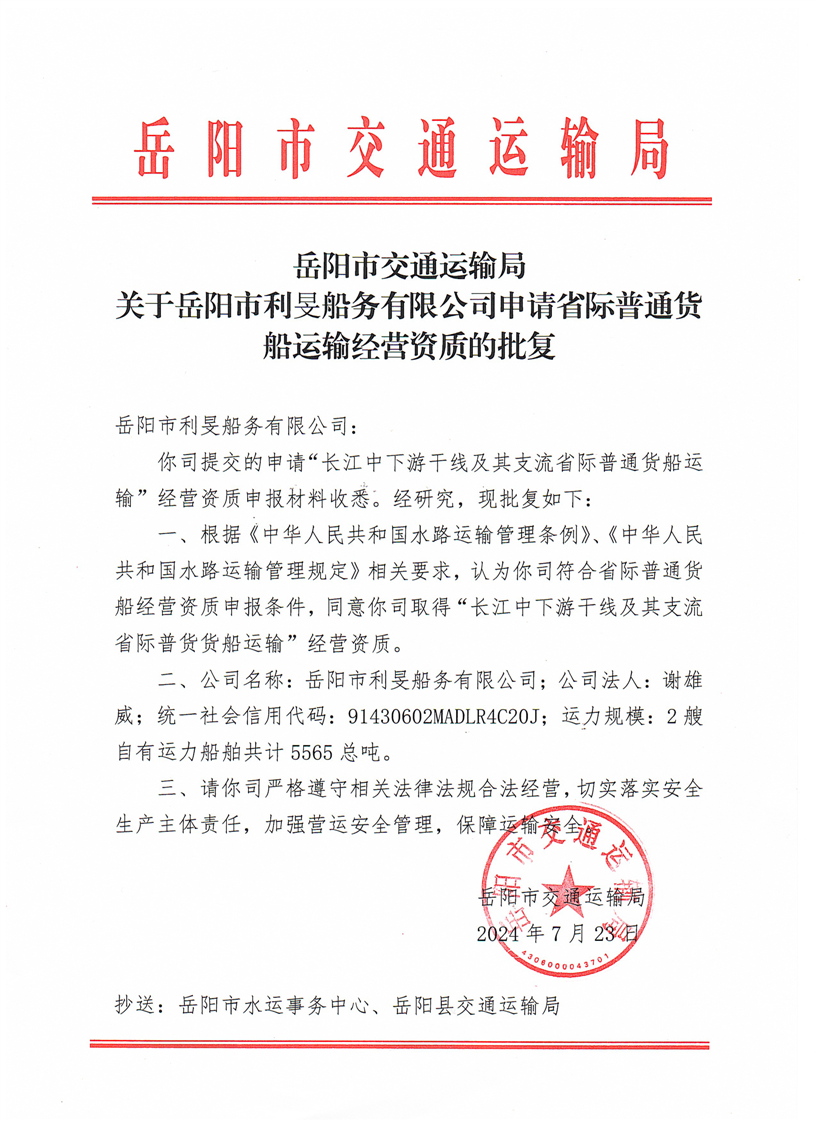 岳阳市交通运输局关于岳阳市利旻船务有限公司申请省际普通货船运输经营资质的批复