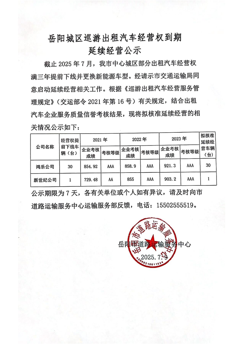 2025年岳阳城区巡游出租汽车经营权到期延续经营公示(九)