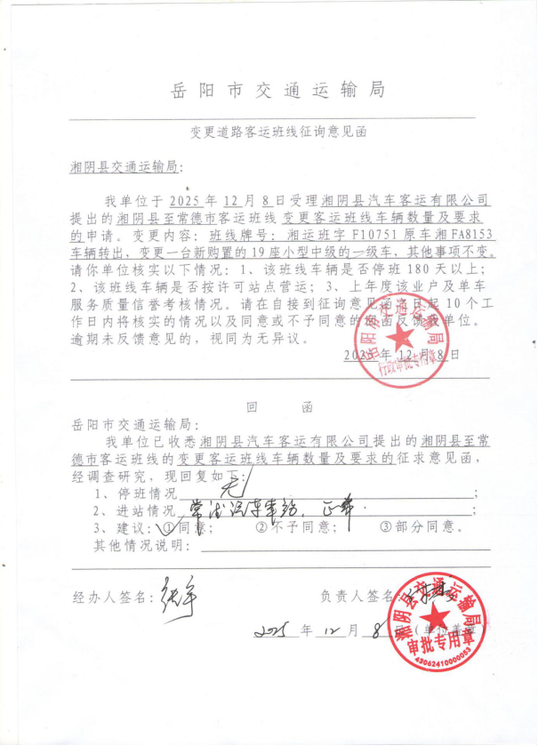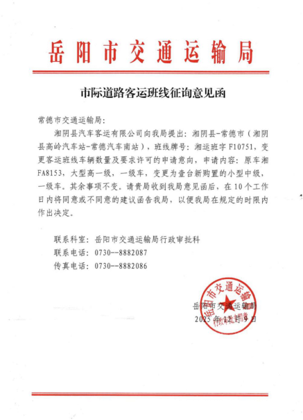 现将我局受理的道路旅客运输相关事项进行公示,如有意见或建议的,请于公示之日起5个工作日内书面向我局行政审批科反映,并在反映材料上署名,所反映的内容必须真实。