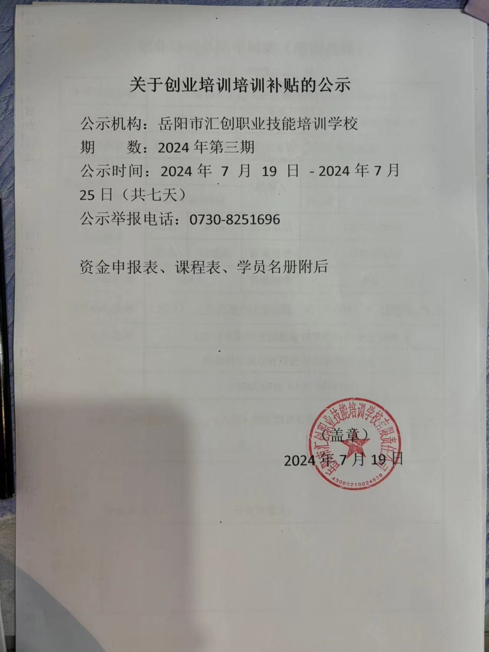 岳阳市汇创职业技能培学校有限责任公司第三期网络创业培训资金申请表、课程表、学员名册