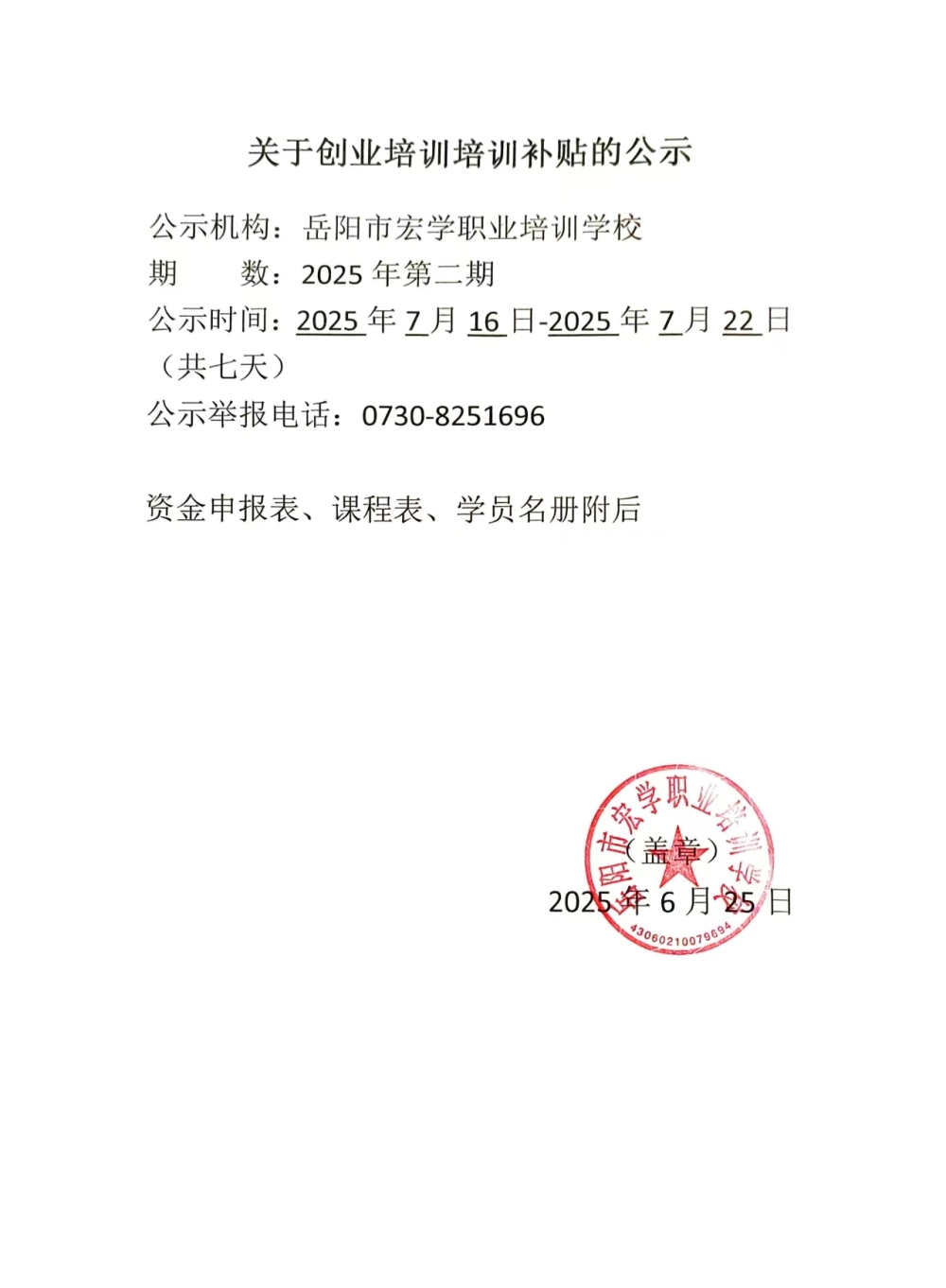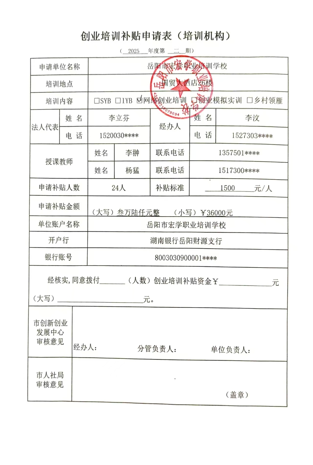 岳阳市宏学职业培训学校2025年第二期网络创业培训资金申请表、课程表、学员名册